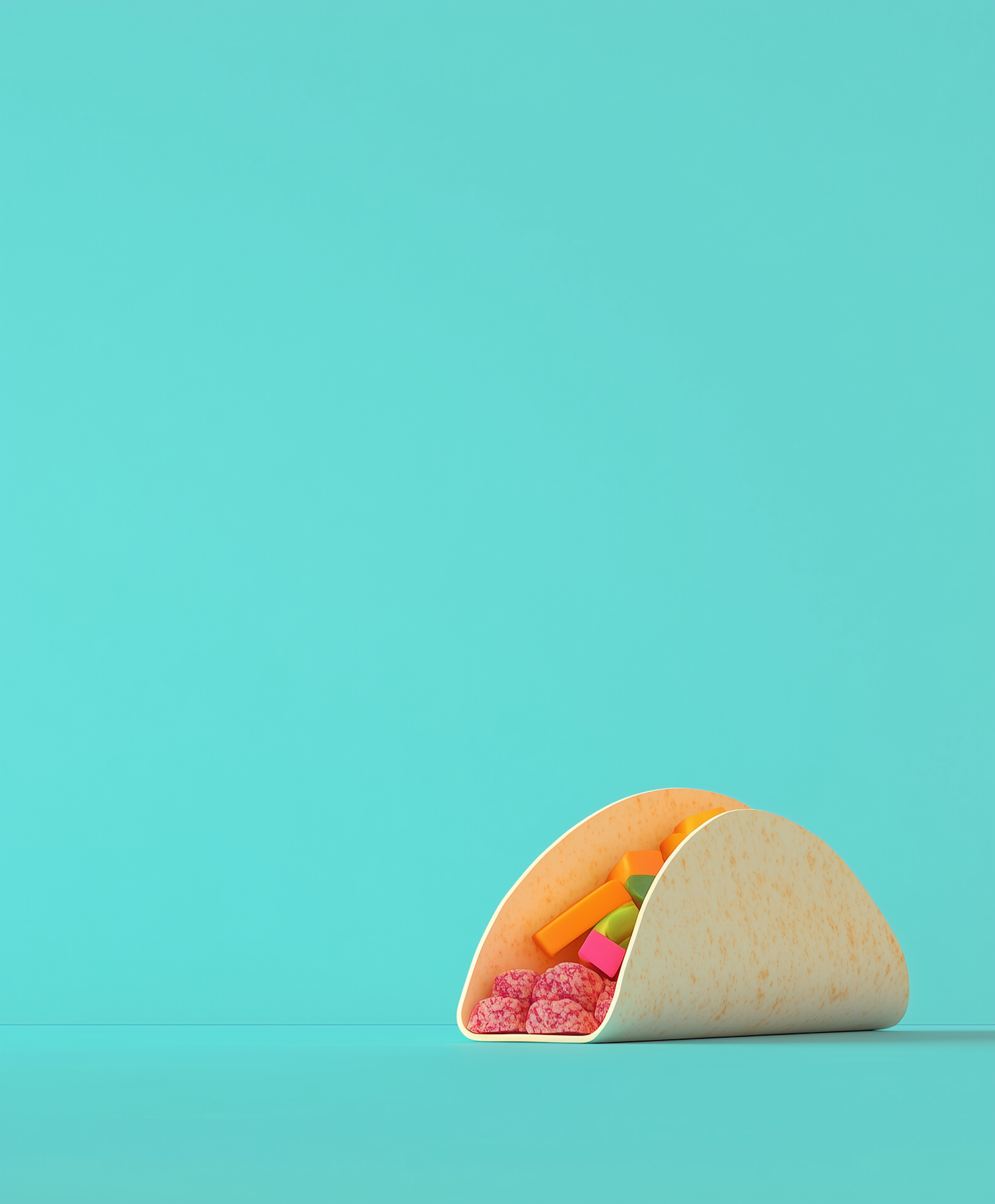 Minimalist taco with colorful geometric fillings against a turquoise background, blending food and abstract art.