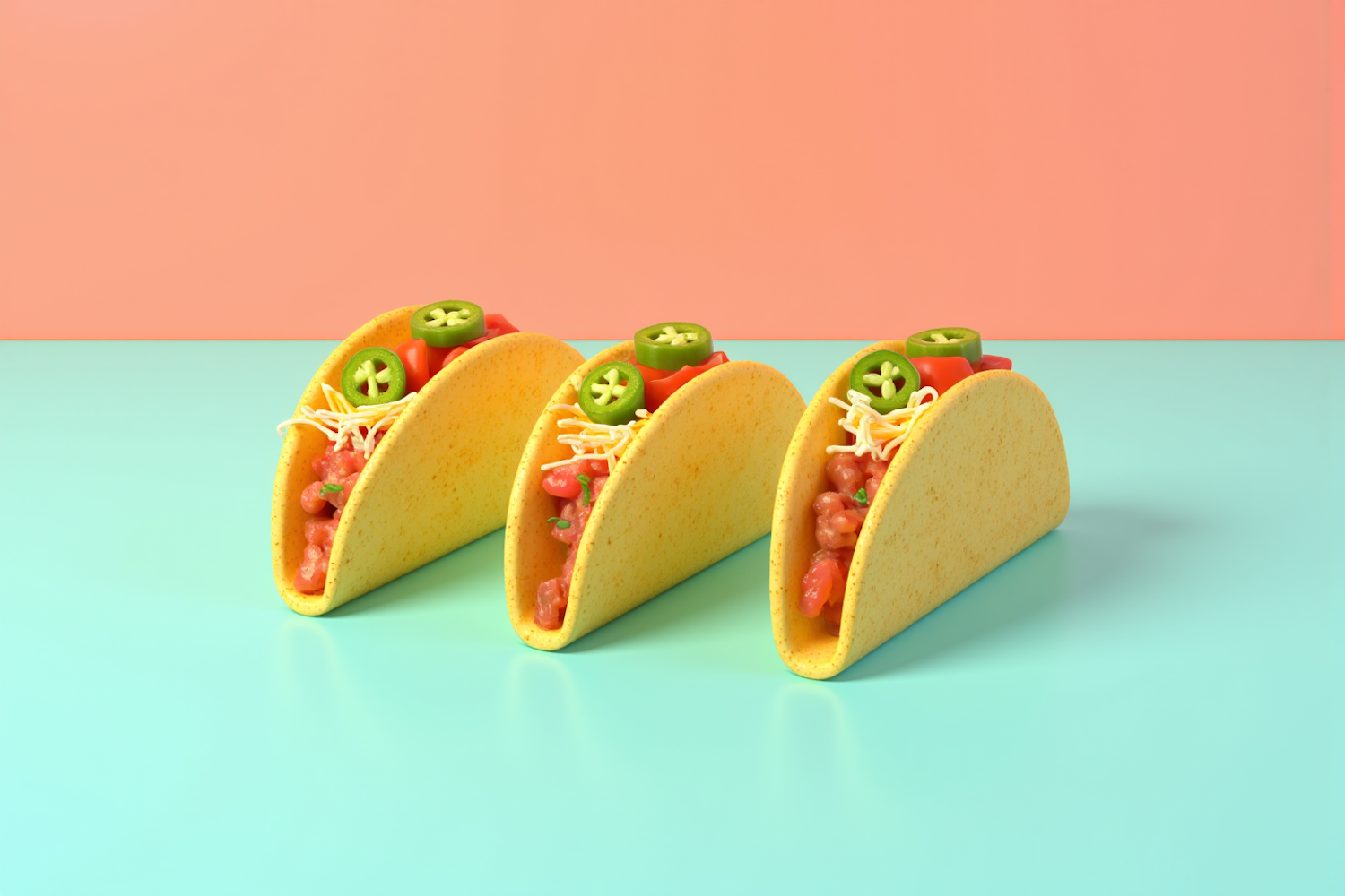 Three vibrant tacos with colorful fillings on a pastel background, perfect for food lovers and taco enthusiasts.