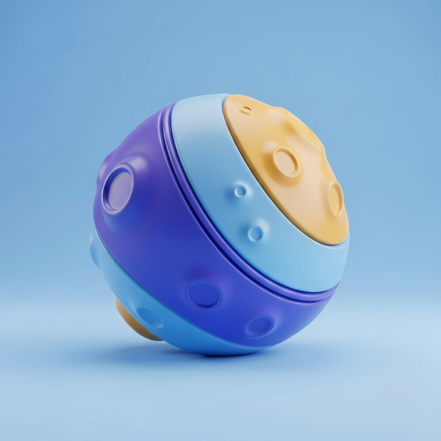 Colorful 3D-rendered sphere with textured segments in yellow, blue, and purple, set against a clean blue background.