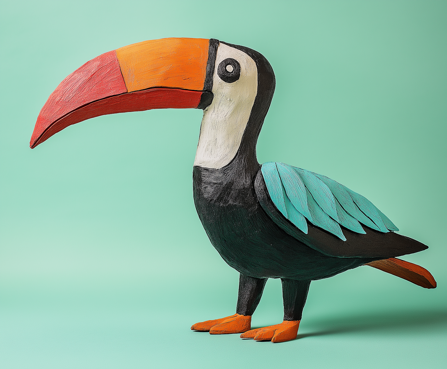 Colorful wooden toucan sculpture with vibrant beak and blue wings on a mint green background.