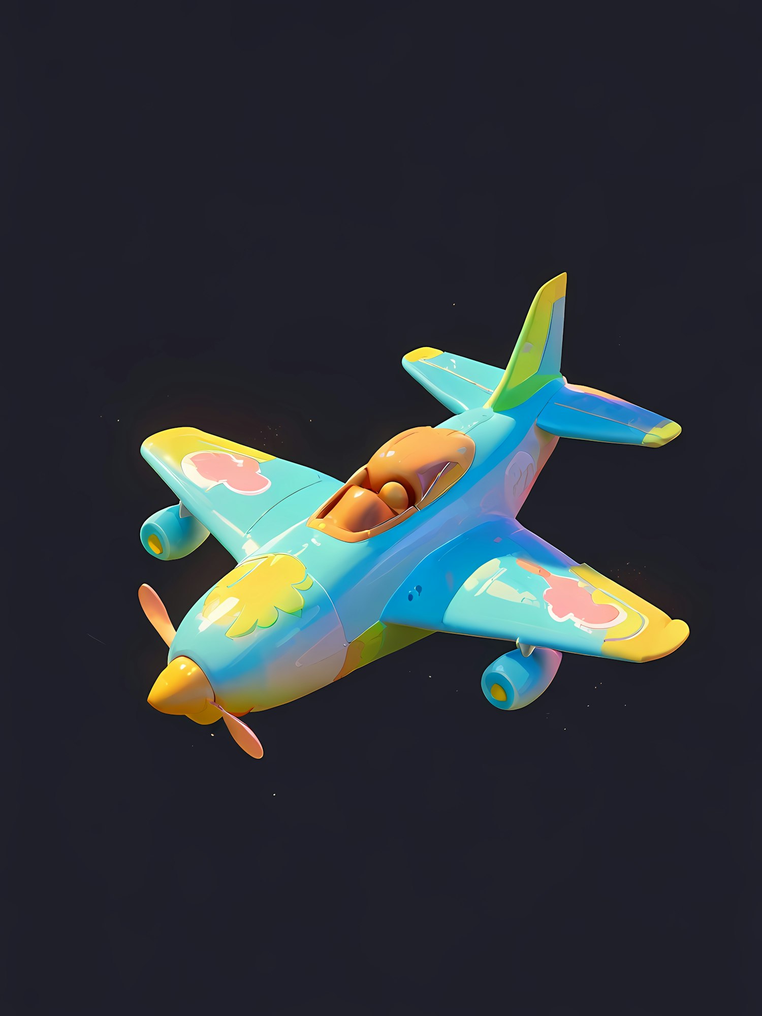 Bright 3D toy airplane with colorful flower and heart patterns, blue body, yellow accents, and orange cockpit on a dark background.