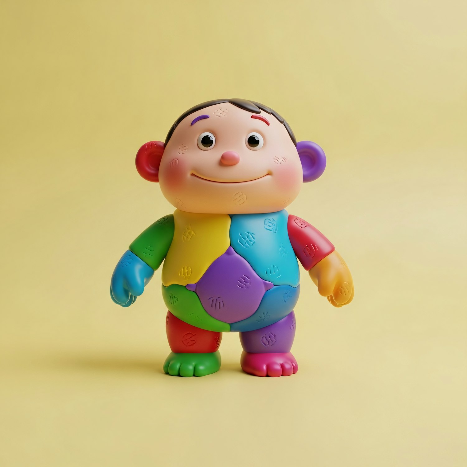 A vibrant toy figure with a patchwork design and cheerful expression, set against a yellow background, perfect for kids or collectors.
