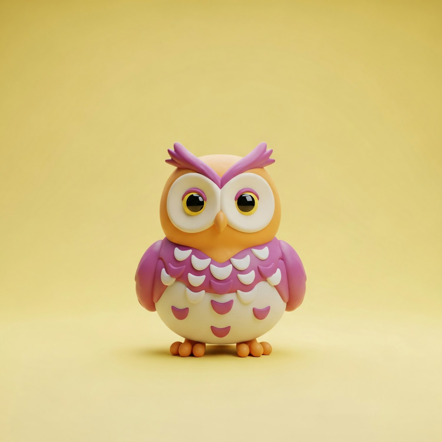 A vibrant toy owl with pink and orange hues stands against a yellow background, showcasing a playful and cheerful design.