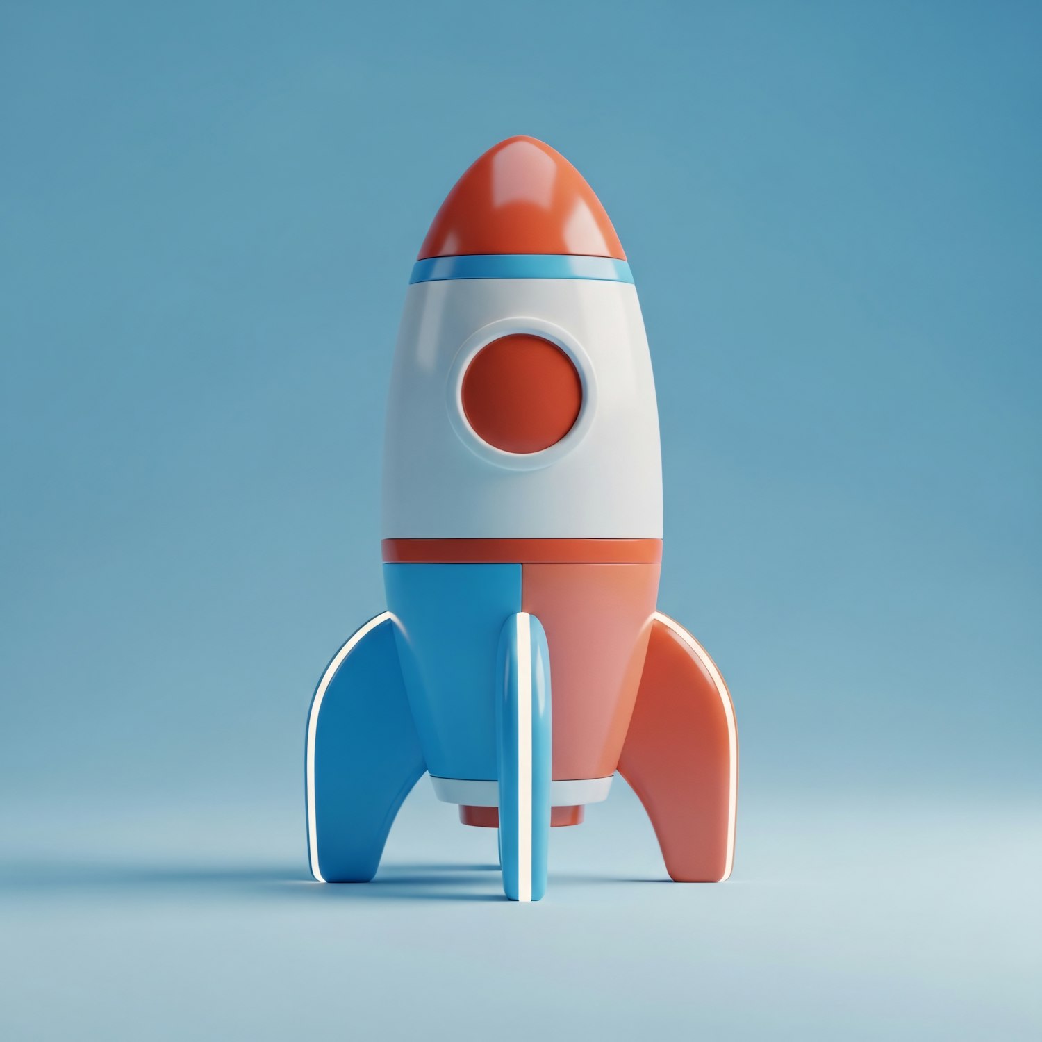 A vibrant toy rocket with orange, blue, and white colors stands against a blue background, showcasing a sleek and playful design.