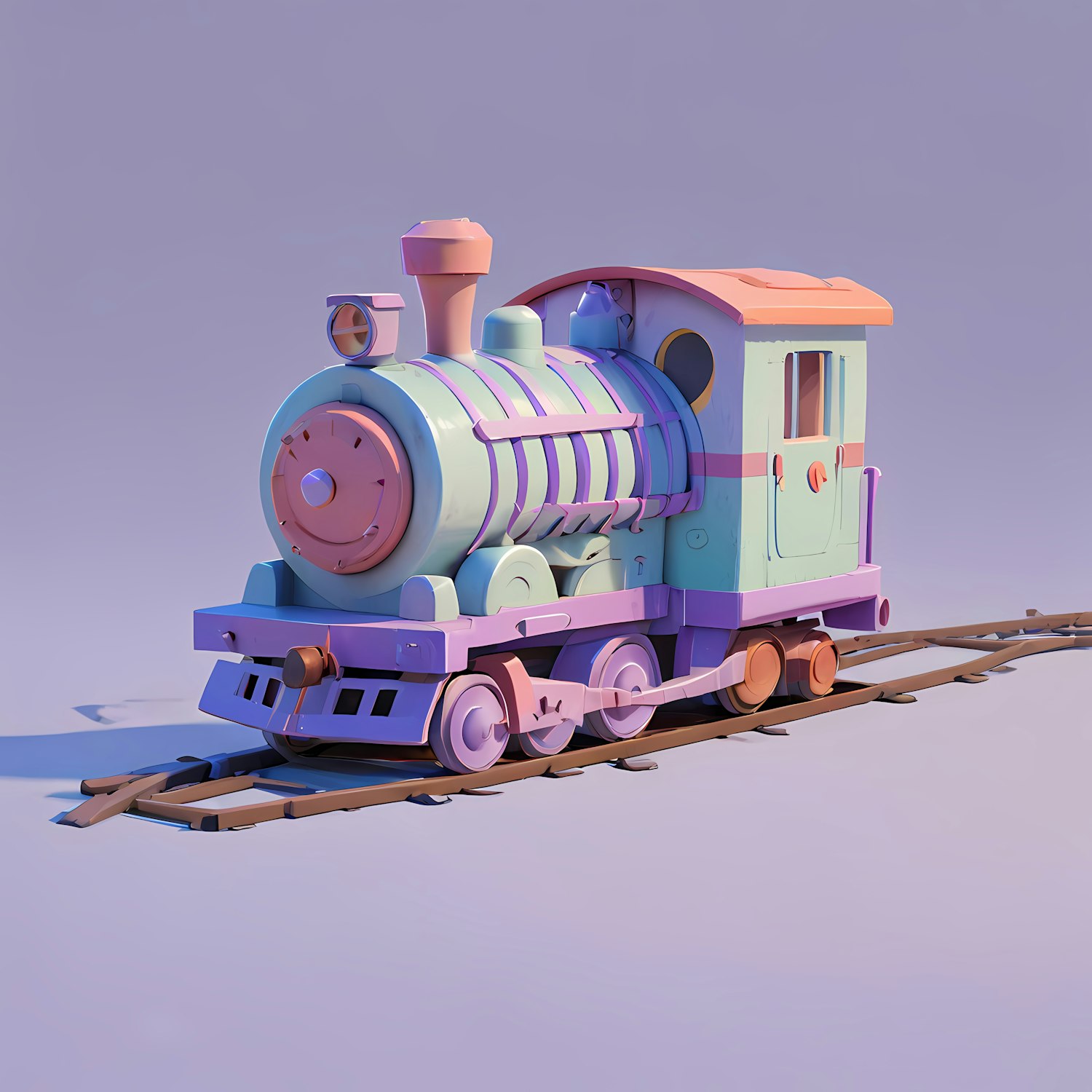 Whimsical 3D toy train in pastel colors on a track, featuring soft pink, purple, and mint green hues against a light purple background.