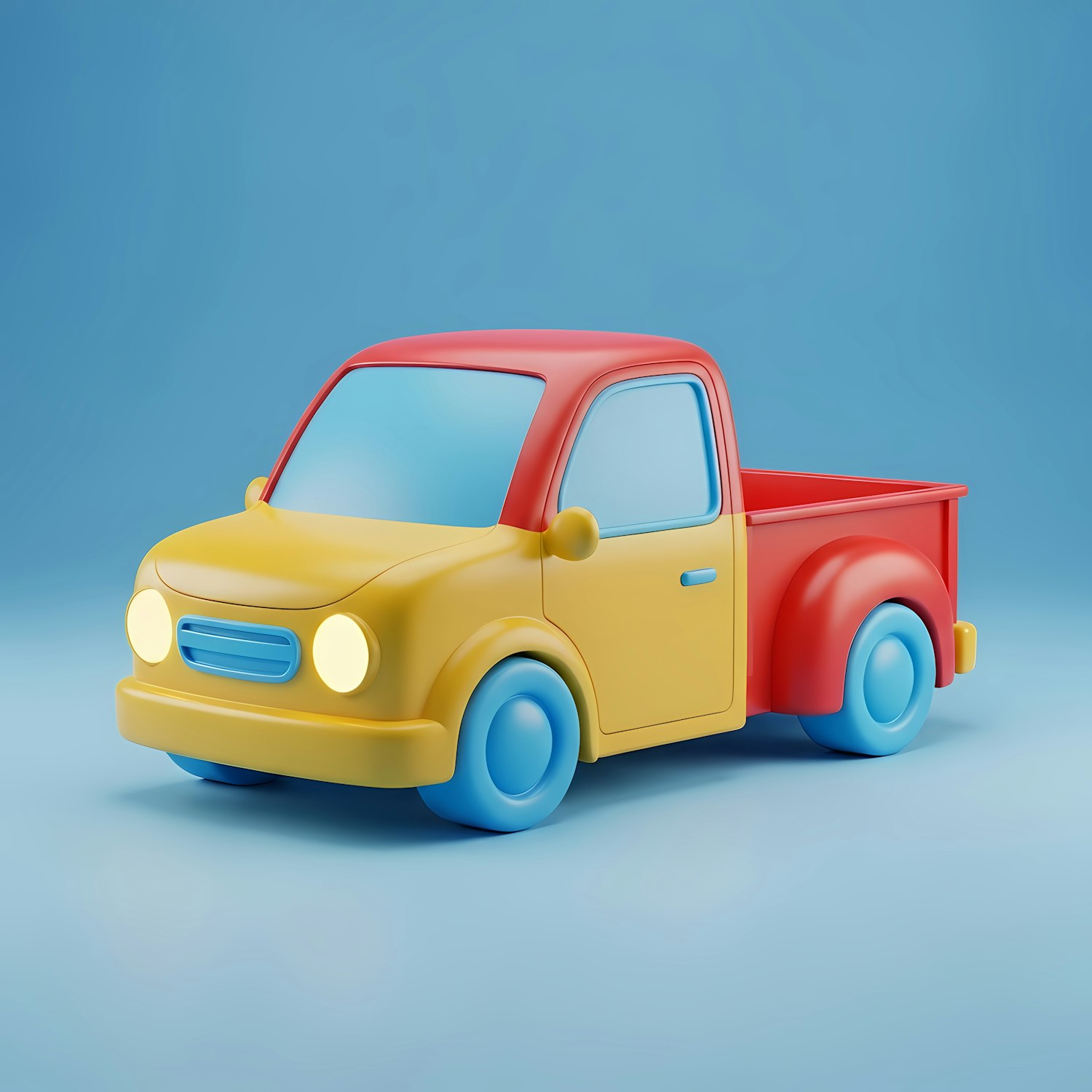Brightly colored toy truck with a yellow body, red roof, and blue wheels, perfect for kids' playtime or decoration.