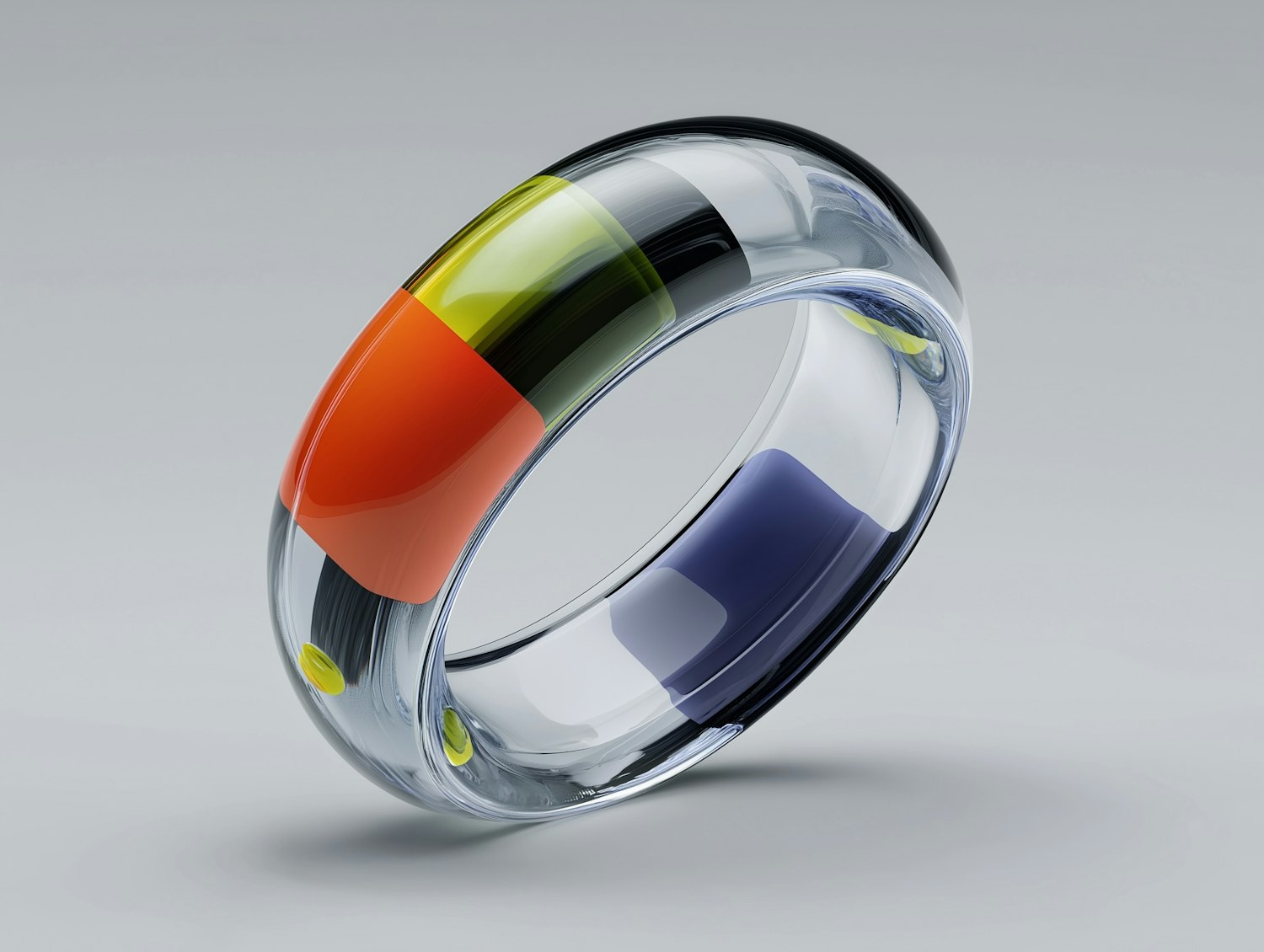 A sleek transparent ring with vibrant orange, green, and blue segments, set against a neutral background for a modern aesthetic.