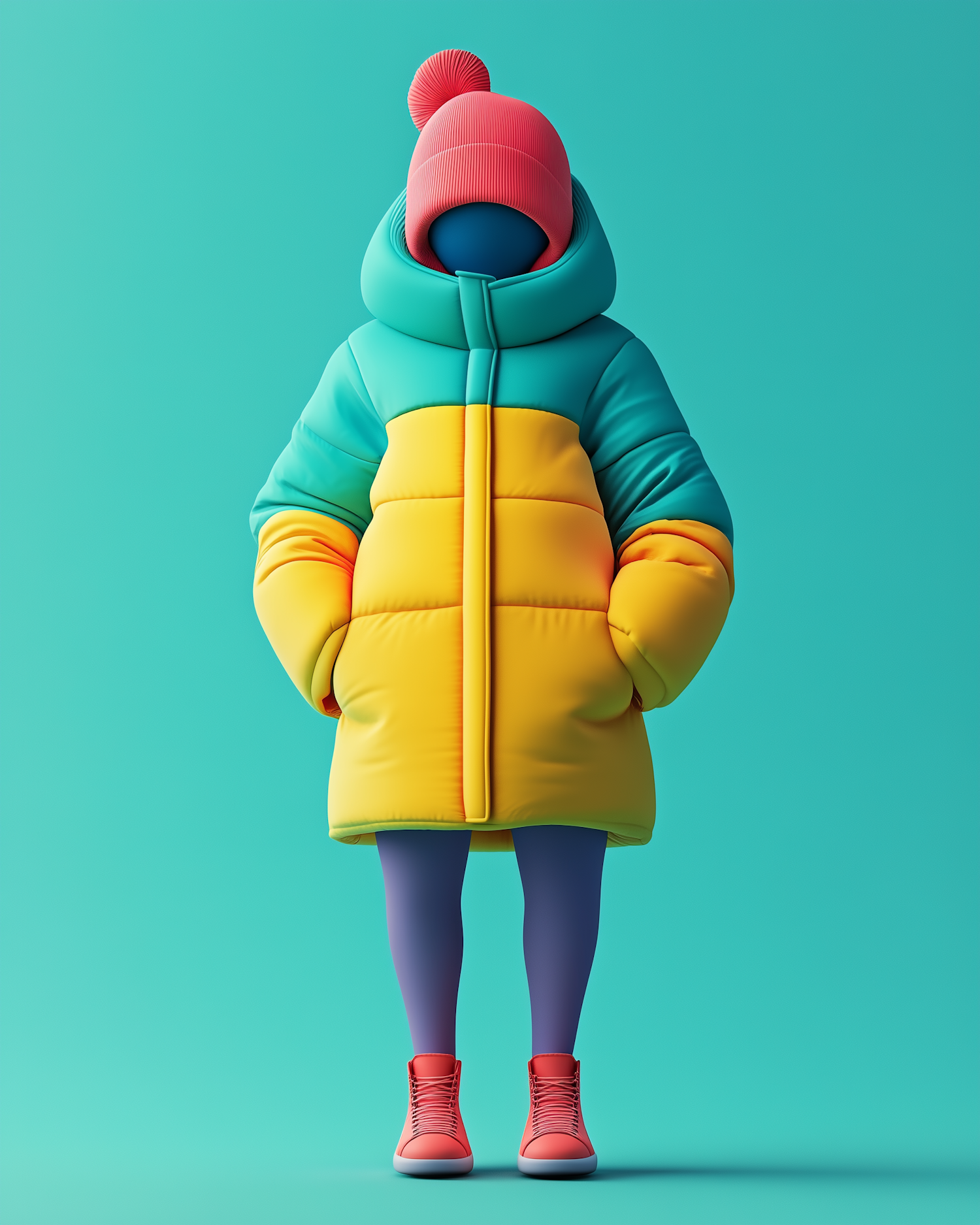 Bright 3D illustration of a faceless figure in a colorful winter outfit with a puffy jacket, red beanie, and sneakers on a teal background.
