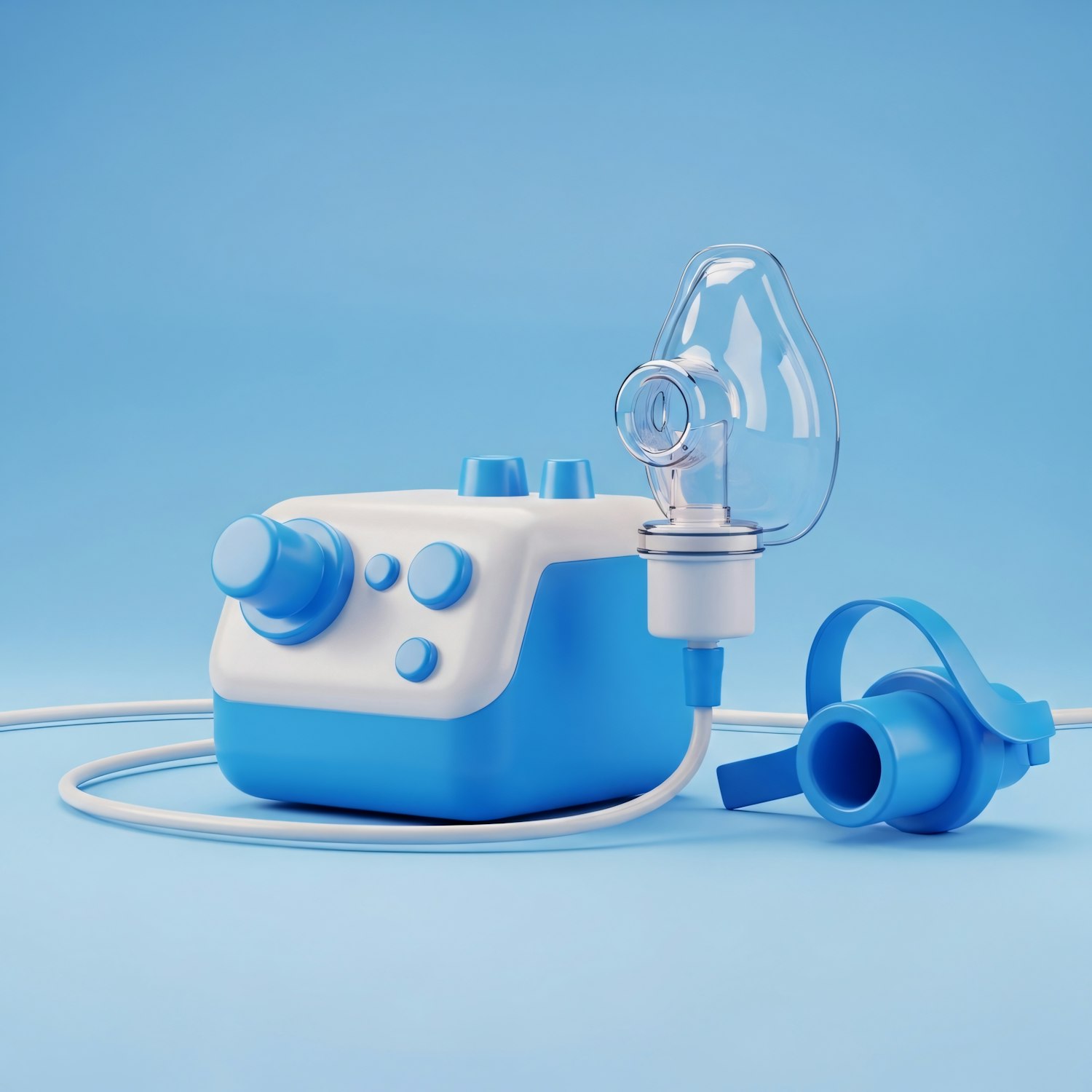 A modern nebulizer with a clear mask and blue accents, set against a clean blue background, showcasing its compact and functional design.