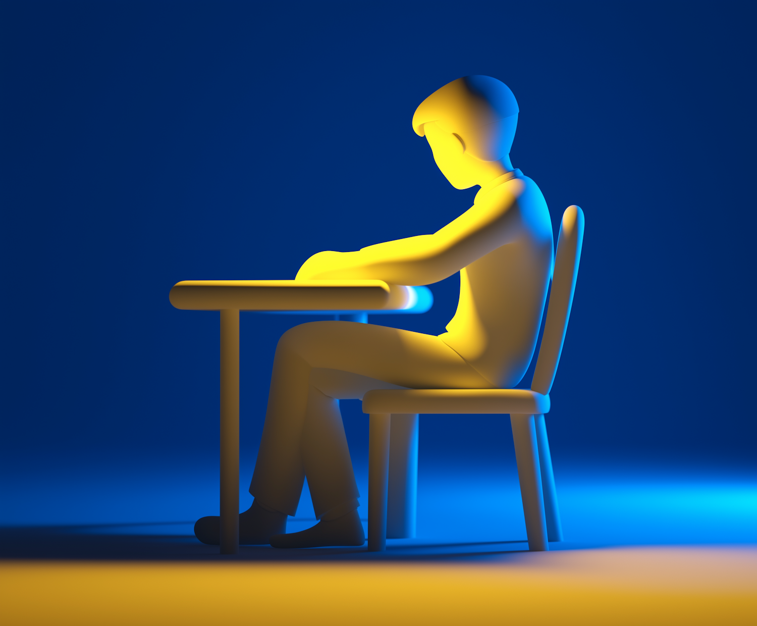 Stylized 3D illustration of a figure sitting at a table, highlighted by dramatic blue and yellow lighting.