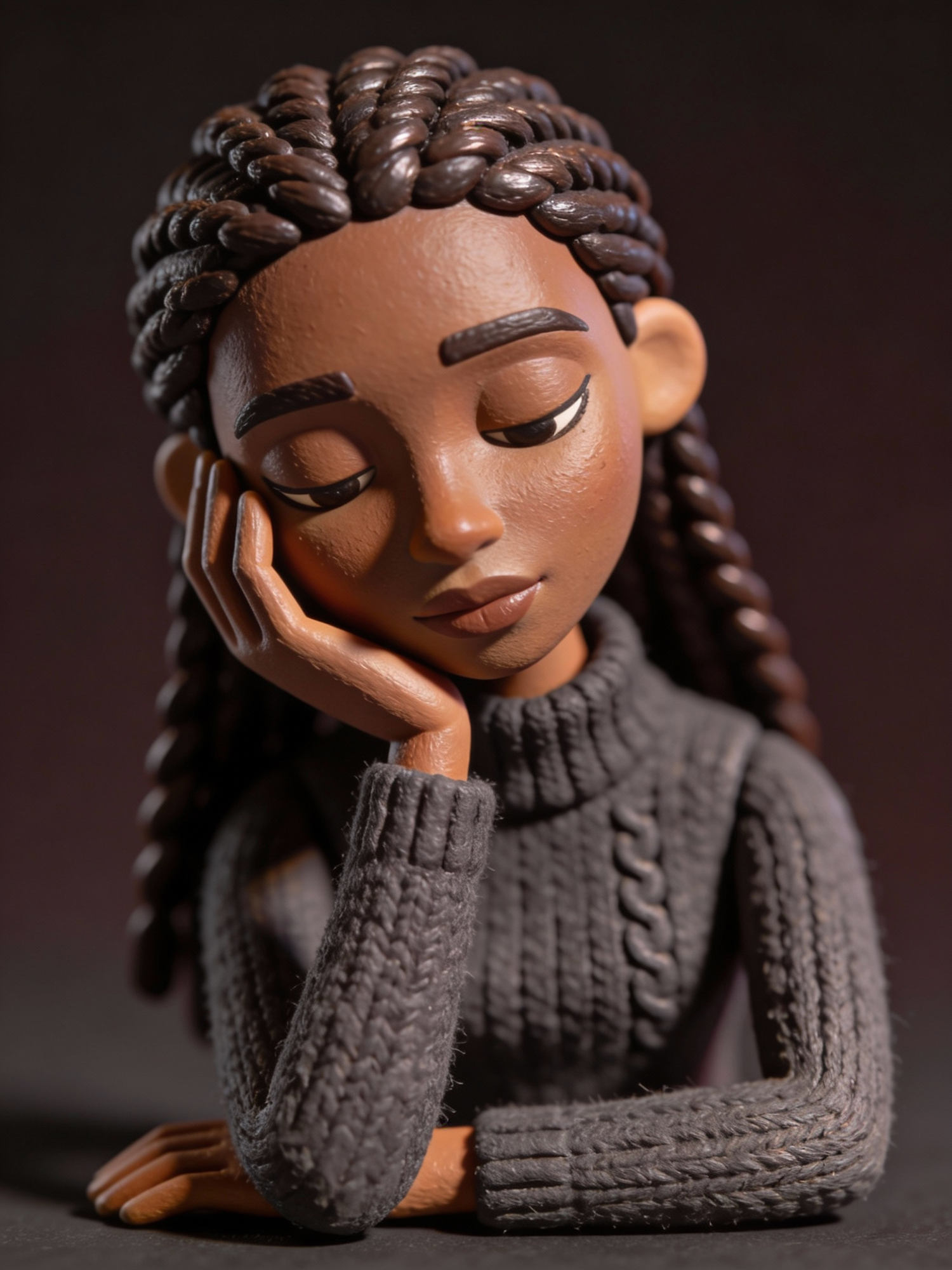 A Black woman with deep brown skin and long, neatly braided hair rests her face gently on her hand in a contemplative pose. Her expression is serene and introspective, evoking quiet strength and emotional depth. She wears a soft, charcoal knit turtleneck sweater—minimalist and textured—whose tone echoes the background while adding warmth and tactile richness. The lighting is dramatic and directional, casting soft highlights across her skin and accentuating its smooth texture and natural sheen. She is framed against a plain, dark background—charcoal or deep espresso brown—to create visual contrast and draw focus to her features. The composition is intimate and minimalist, emphasizing mood, gesture, and the quiet power of presence. Hyperrealistic rendering should highlight skin texture, braid detail, knit fabric, and the interplay of light and shadow with emotional clarity and visual precision.