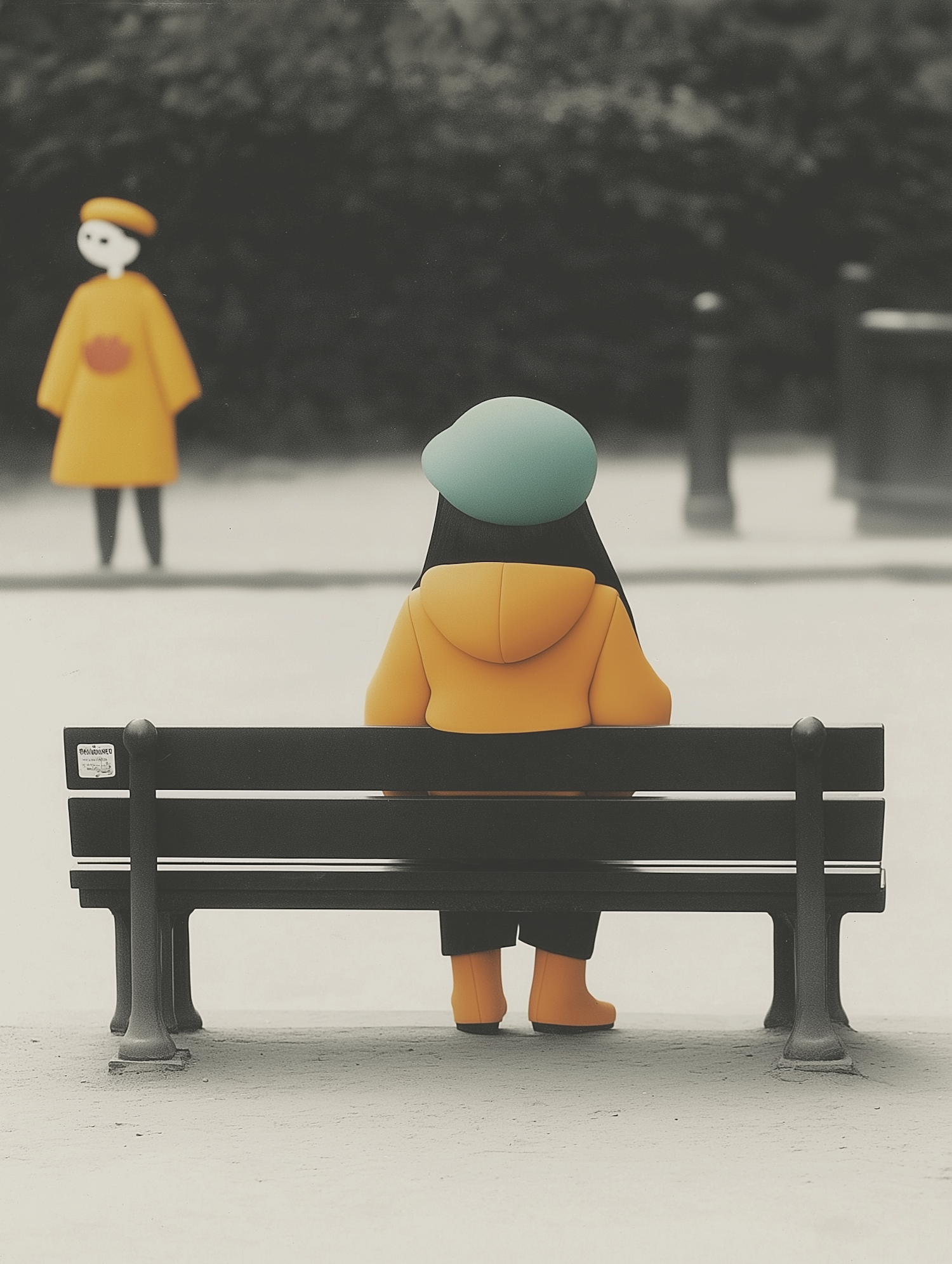 Stylized illustration of a person in orange on a park bench, with another figure in the distance. Minimalistic and vibrant.