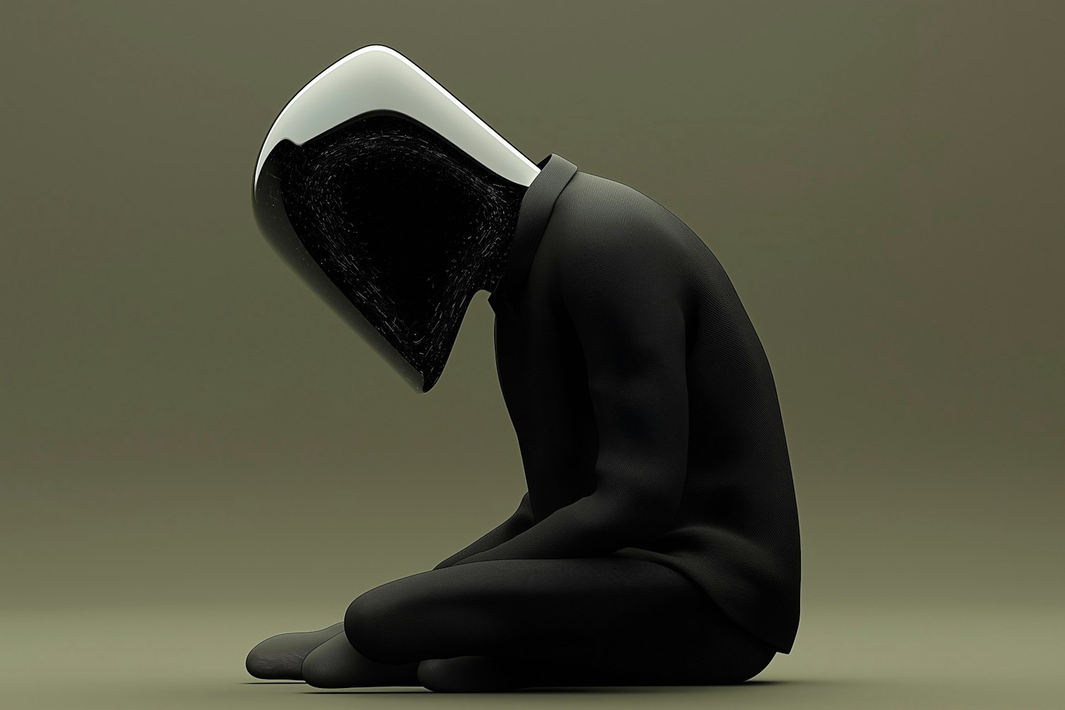 Abstract black figure with a helmet-like head sits in contemplation against a muted green background, exuding a futuristic vibe.
