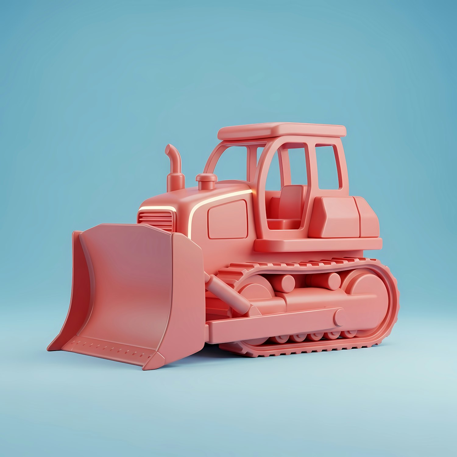 A vibrant 3D illustration of a coral pink toy bulldozer against a light blue background, showcasing its detailed and playful design.
