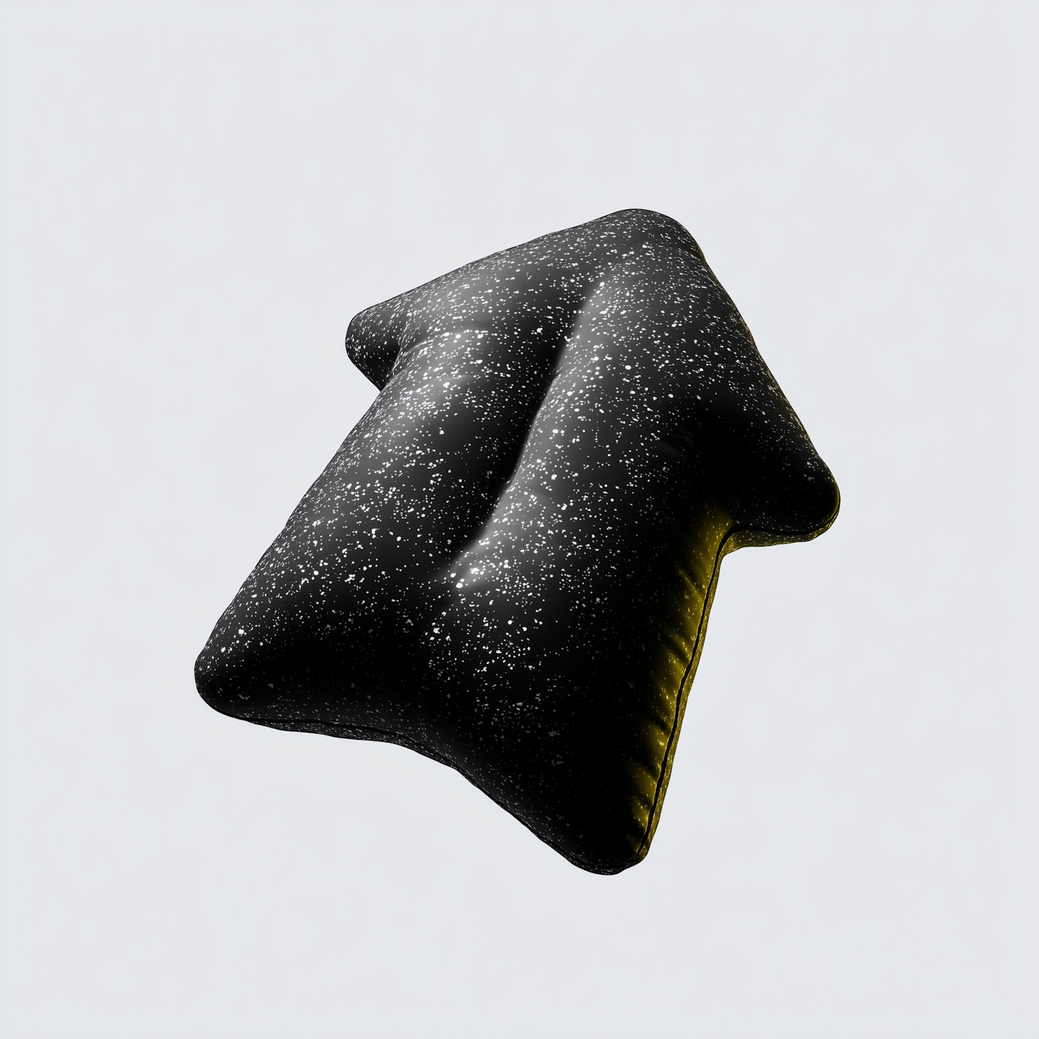 A glossy black arrow-shaped object with a speckled white pattern floats against a minimalistic light gray background.