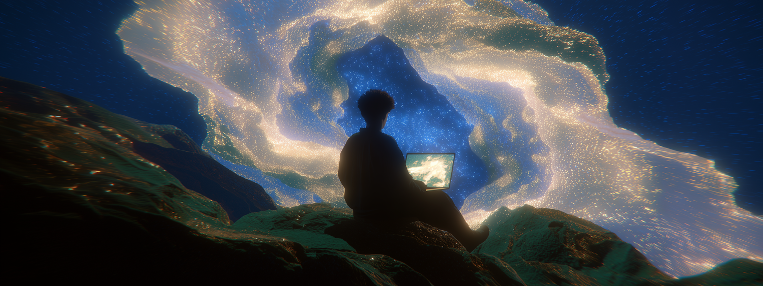 A silhouette of a person with a glowing laptop sits before a cosmic swirl of blue and gold, creating a surreal and dreamlike scene.