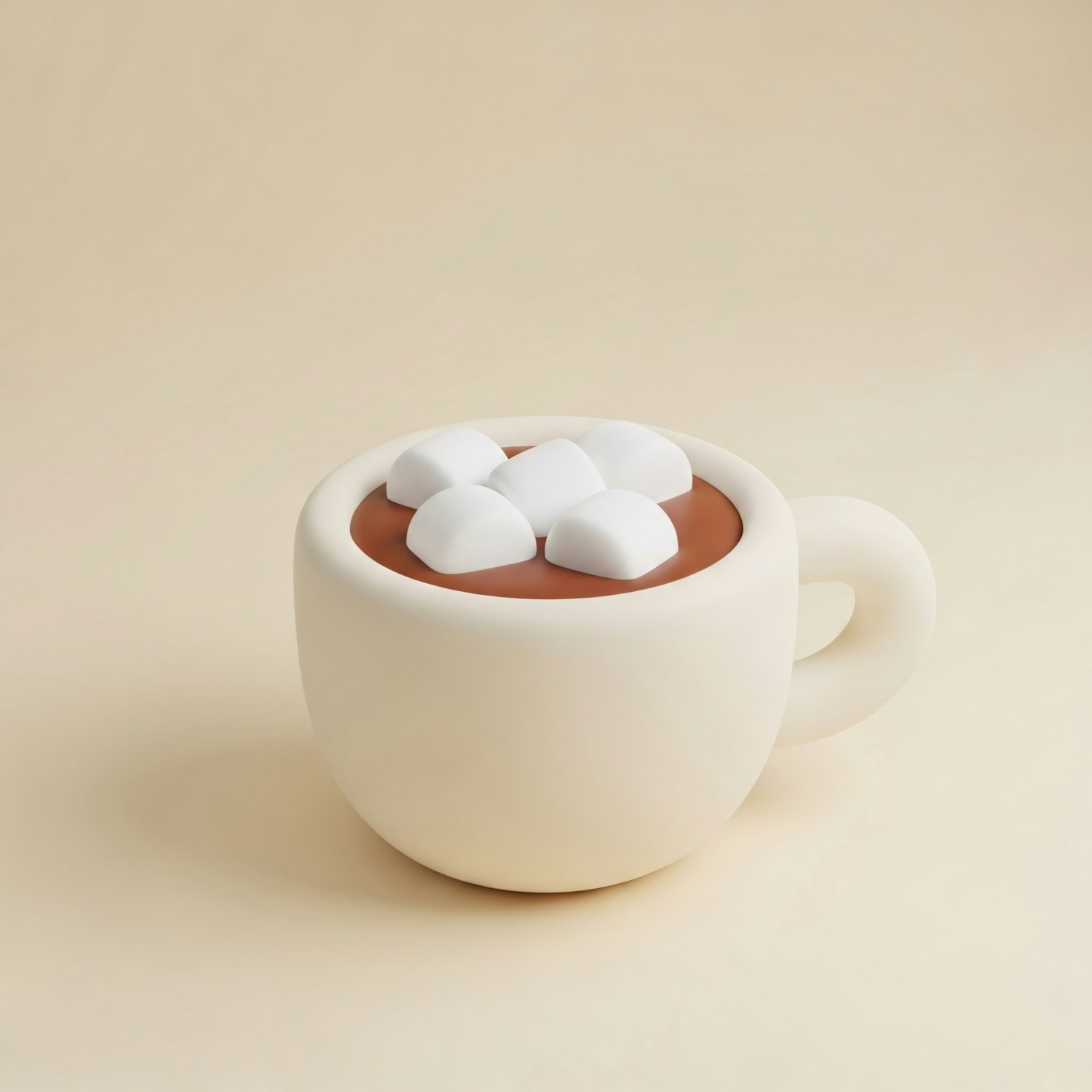 A cozy white mug of hot chocolate topped with marshmallows, set against a soft beige background for a minimalist and warm vibe.