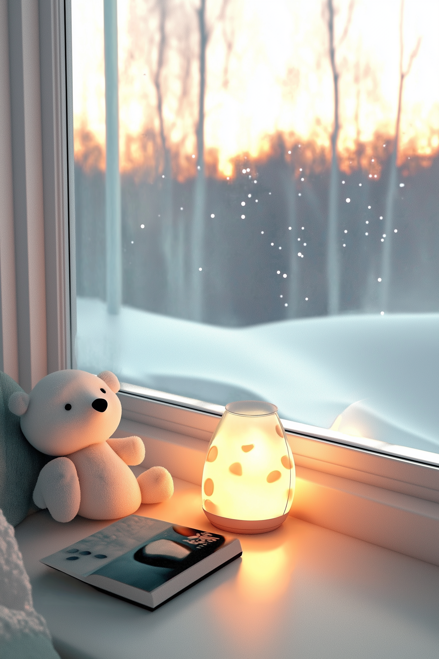 Cozy windowsill with a teddy bear, glowing lamp, and open book against a snowy sunset backdrop.