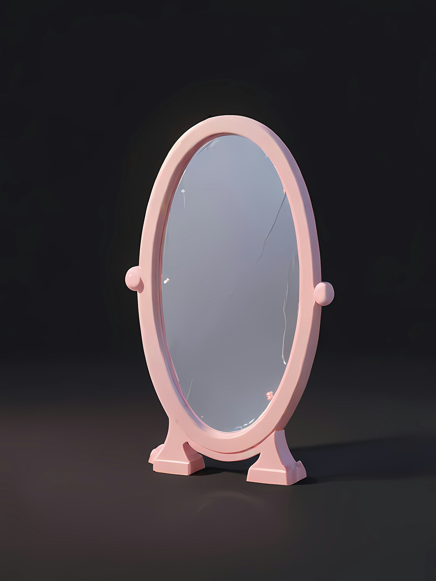 A pink oval mirror with a cracked surface, set against a dark background, showcasing a blend of elegance and imperfection.