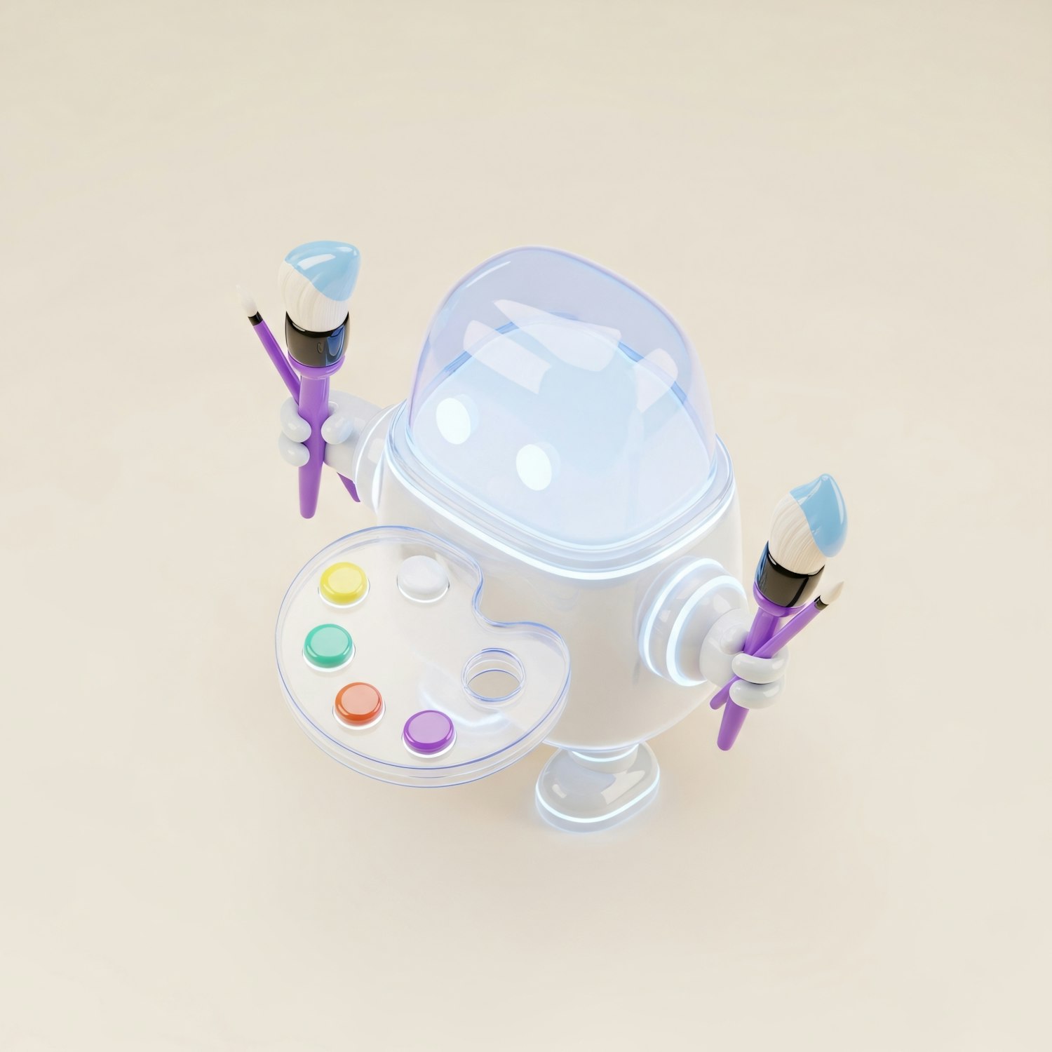 A 3D-rendered robot with a painter's palette and brushes, featuring a sleek design and vibrant colors on a soft beige background.