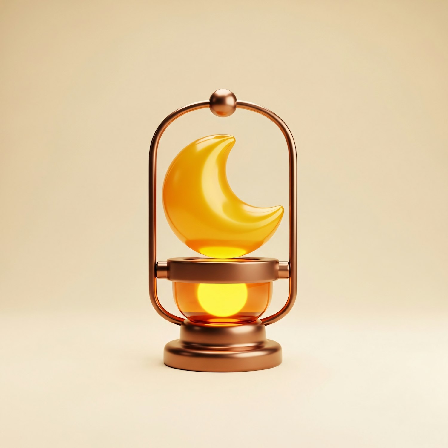 A stylish bronze lamp with a glowing yellow crescent moon centerpiece, set against a neutral beige background.