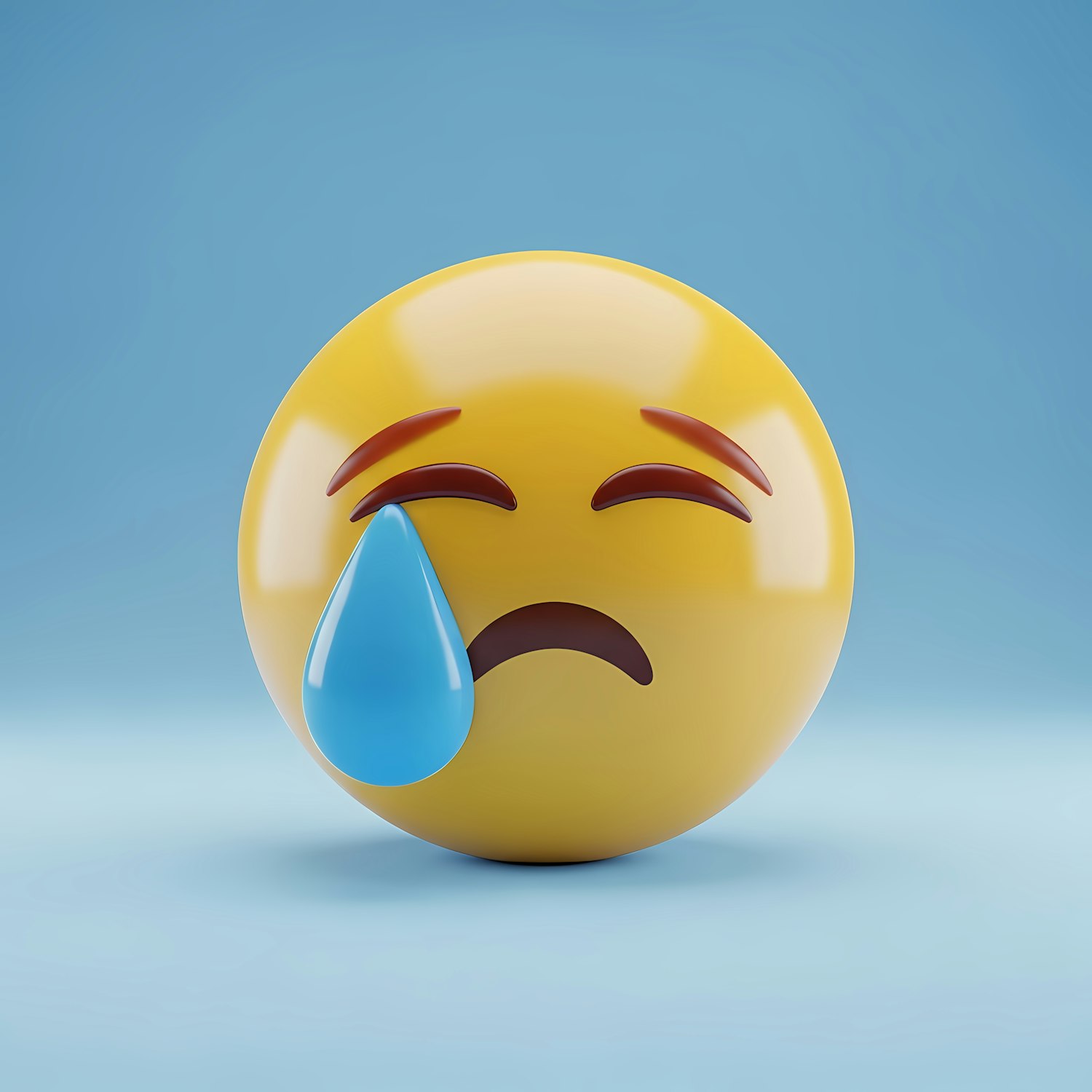 3D crying emoji with a sad expression and a single tear, set against a soft blue background. Perfect for expressing sadness or empathy.