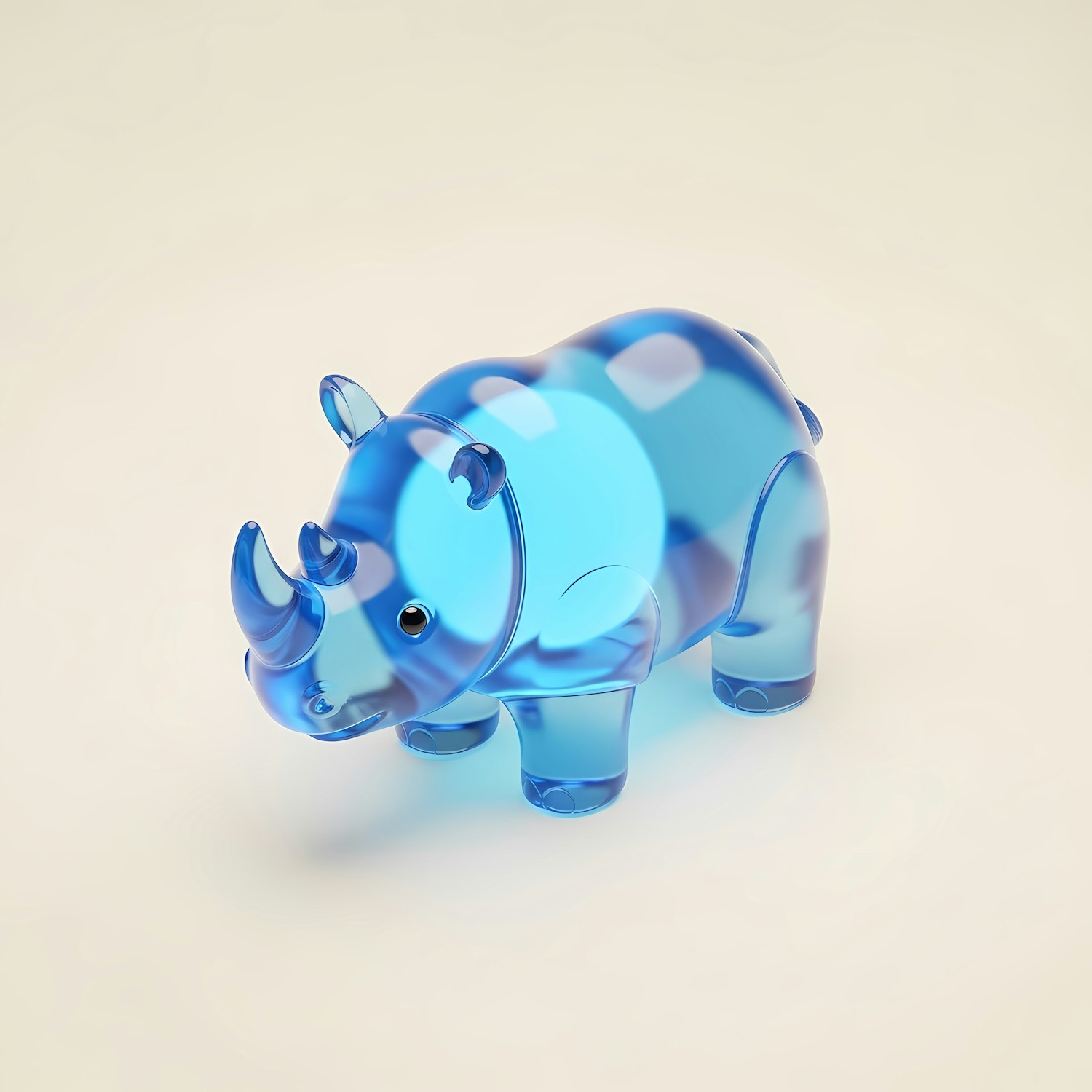 A 3D-rendered translucent blue rhinoceros with a glossy finish, set against a neutral background, showcasing a modern and artistic design.