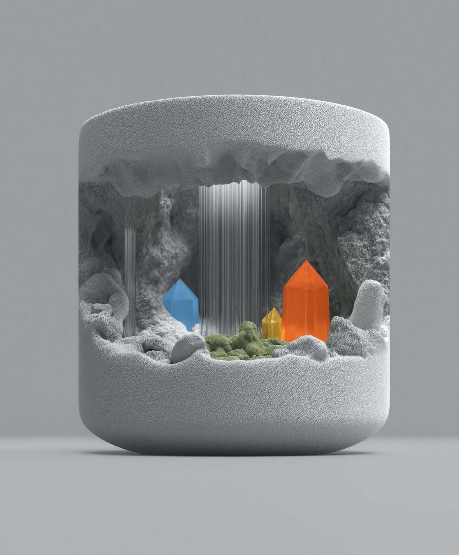 A 3D-rendered cylindrical cave with glowing crystals and a light waterfall inside, set against a textured gray exterior.