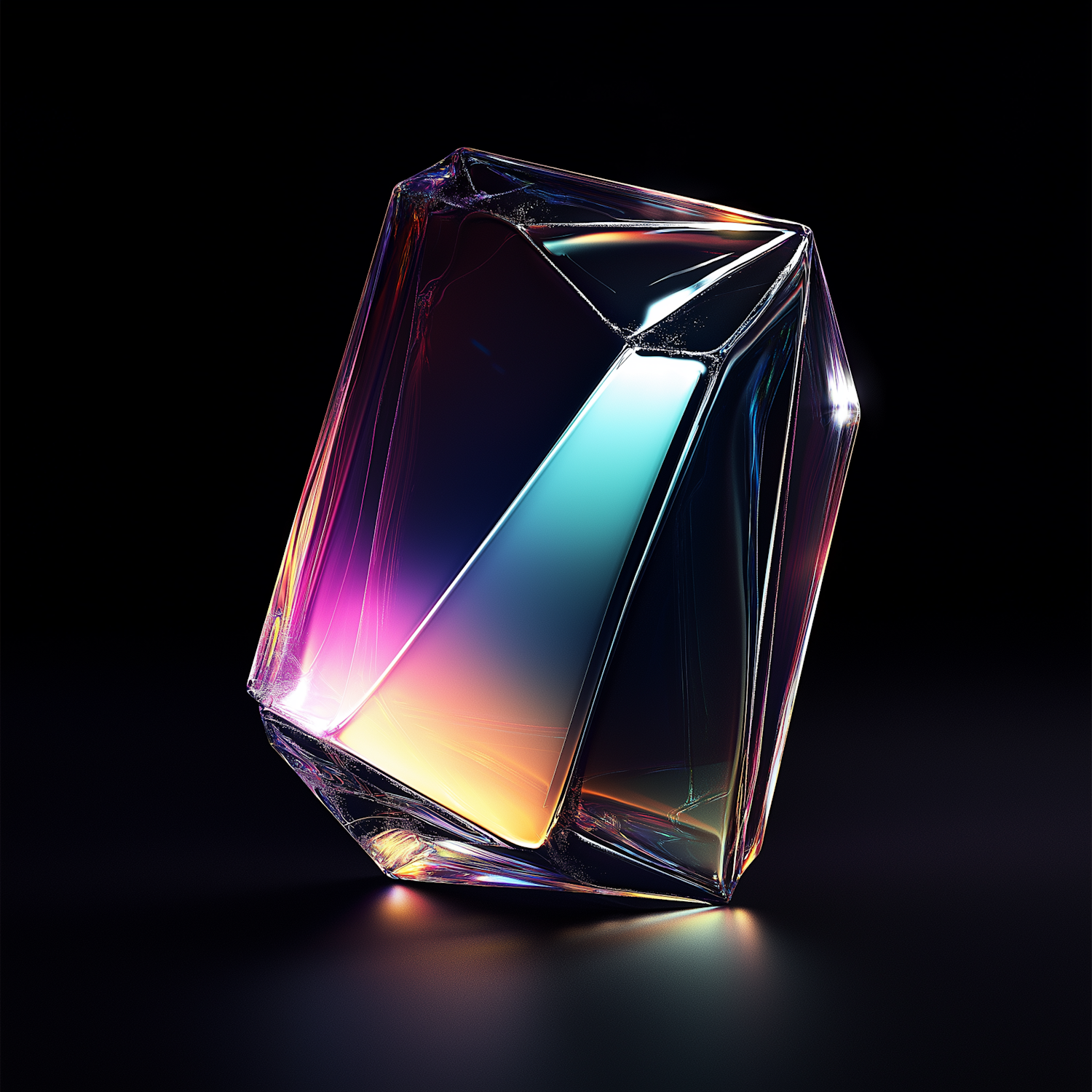 A vibrant 3D crystal prism refracting colorful light on a black background, showcasing sharp edges and a sleek, modern design.