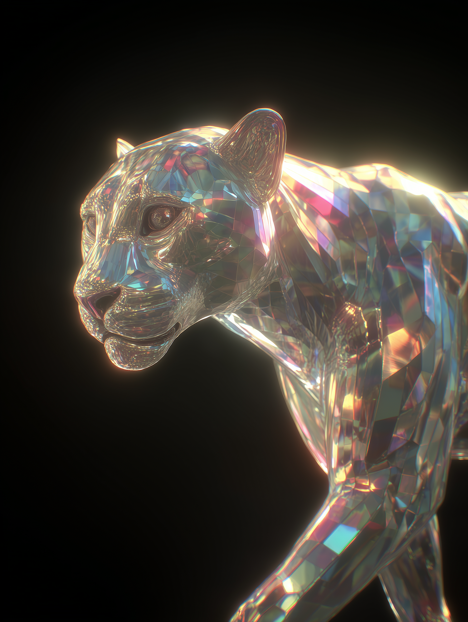 A 3D-rendered crystalline panther reflecting vibrant colors against a dark background, showcasing intricate details and dynamic design.