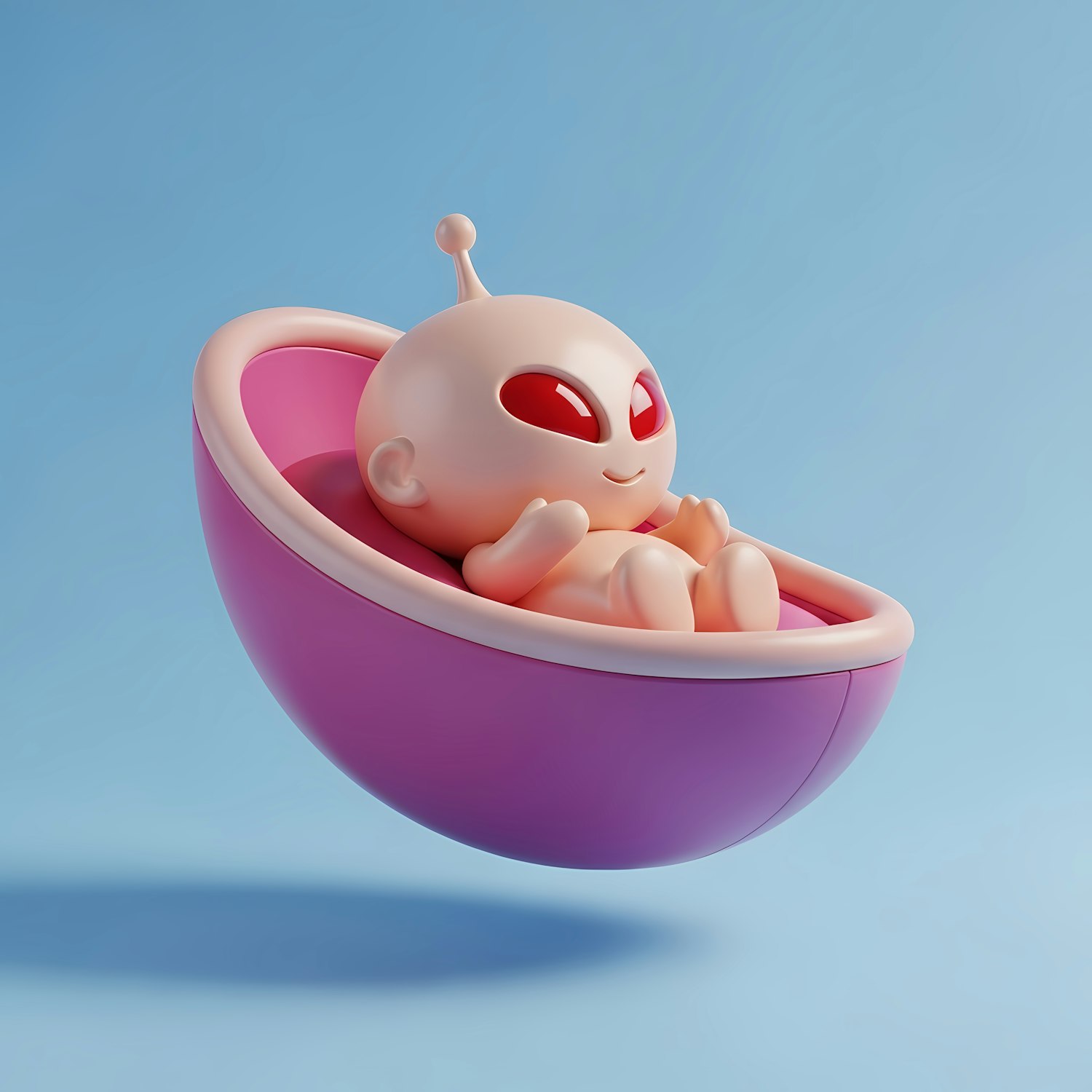 Adorable 3D alien baby lounging in a pink pod against a light blue background. Perfect for sci-fi or cute character design inspiration.