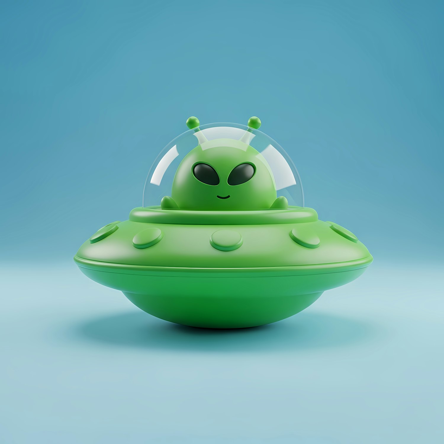 Adorable 3D alien in a green UFO with a transparent dome, set against a light blue background. Perfect for sci-fi or kids' themes.