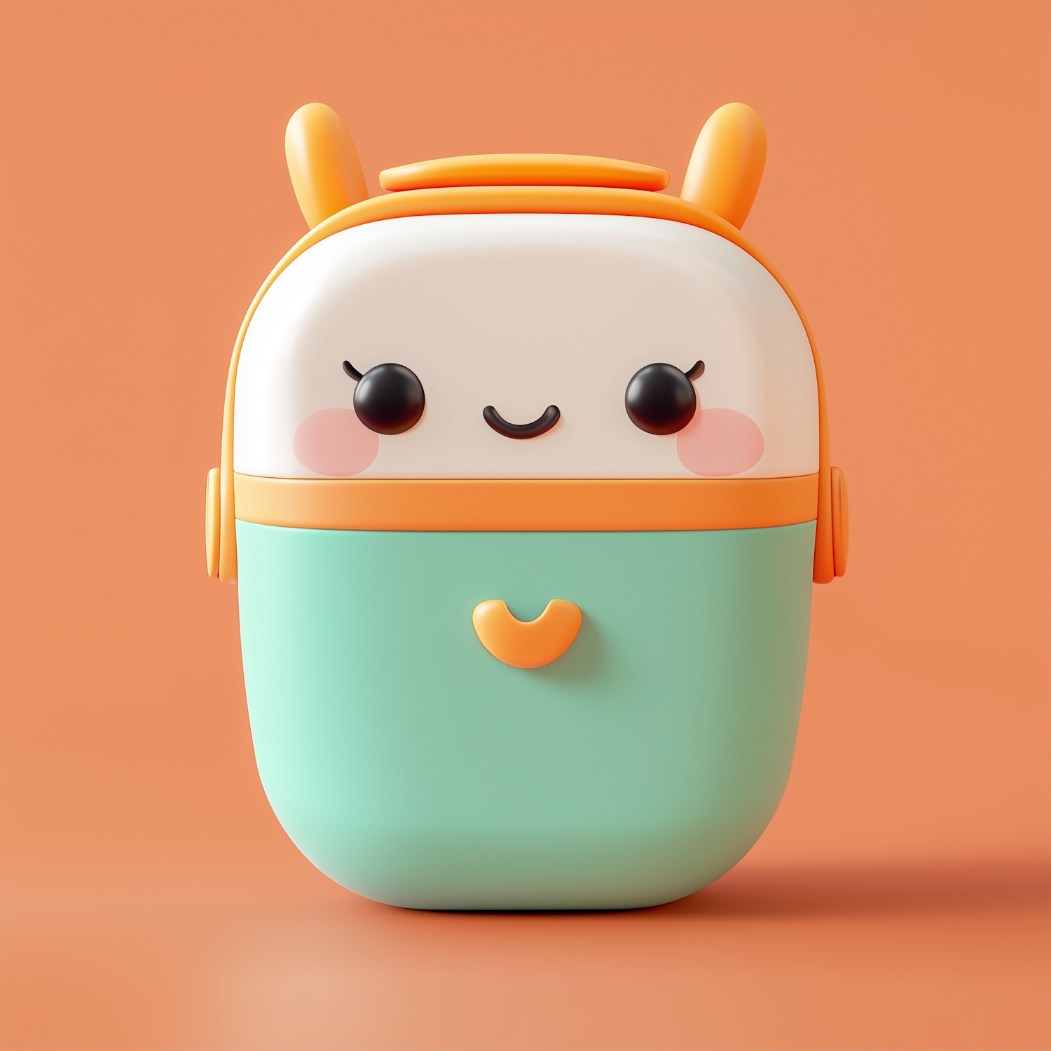 Adorable cartoon character with a teal body and orange accents, featuring a smiling face and cute ears on a warm orange background.