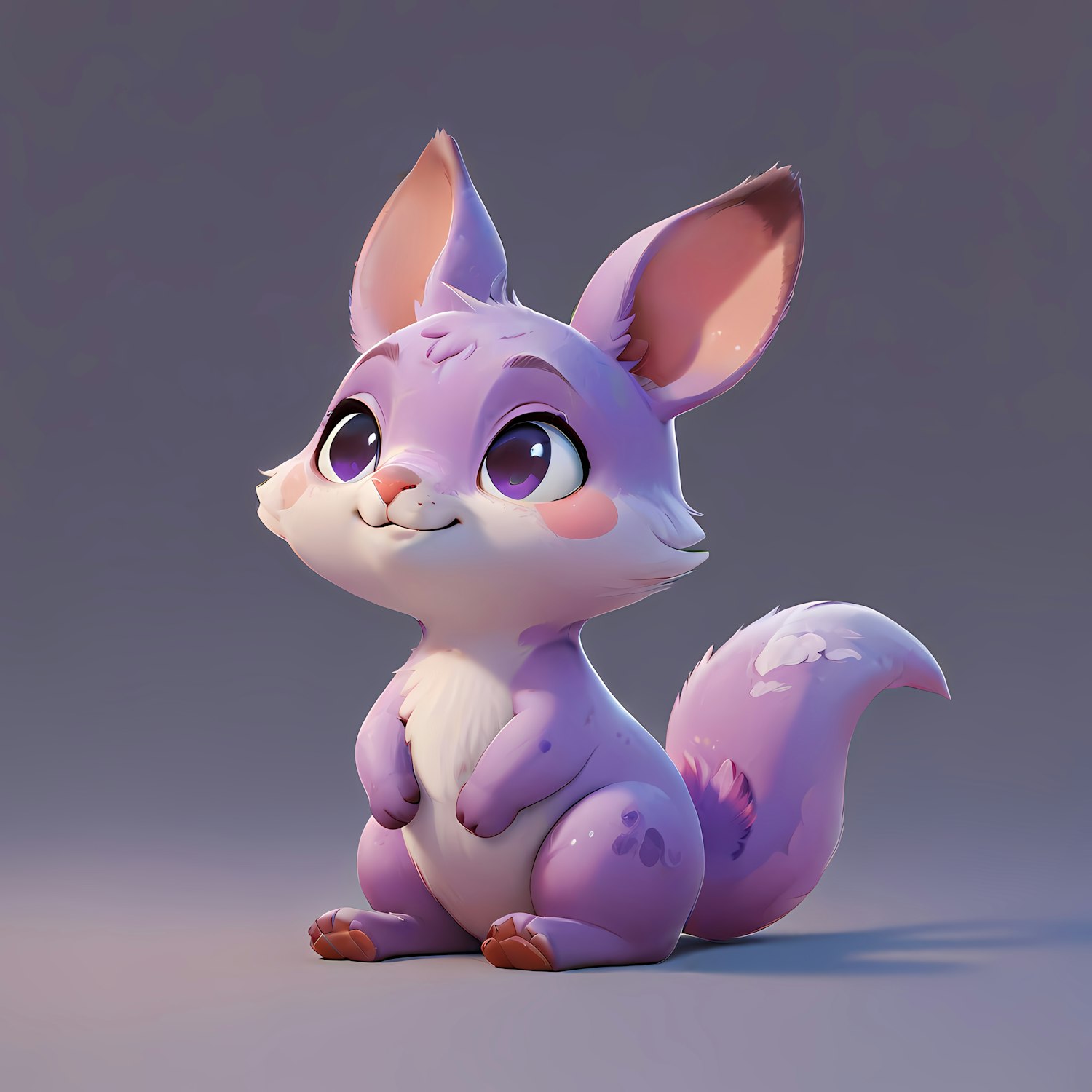 Adorable purple cartoon creature with big eyes and fluffy tail, sitting cutely. Perfect for fans of cute and whimsical characters.