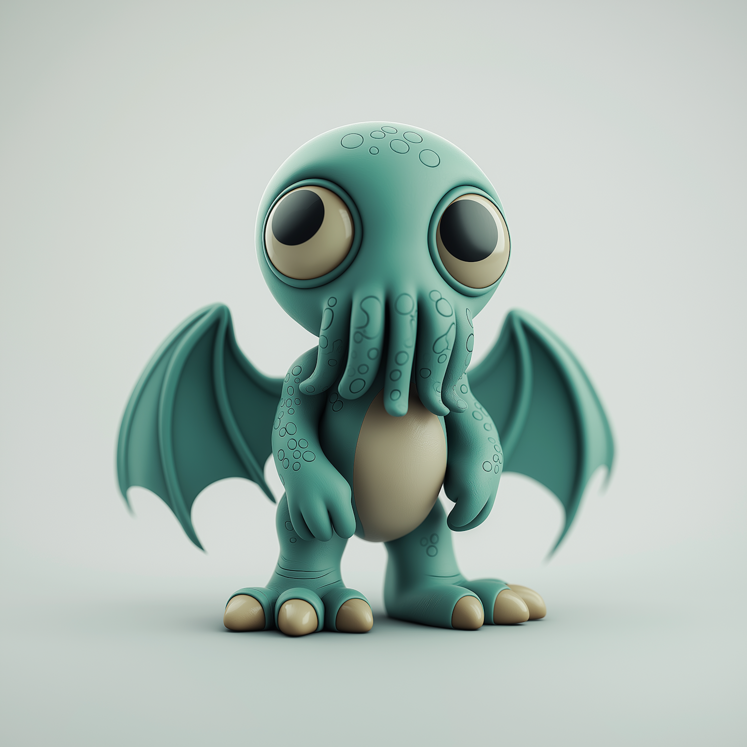Adorable cartoon Cthulhu with teal body, big eyes, and small wings. Playful design with tentacles and clawed feet on a plain background.
