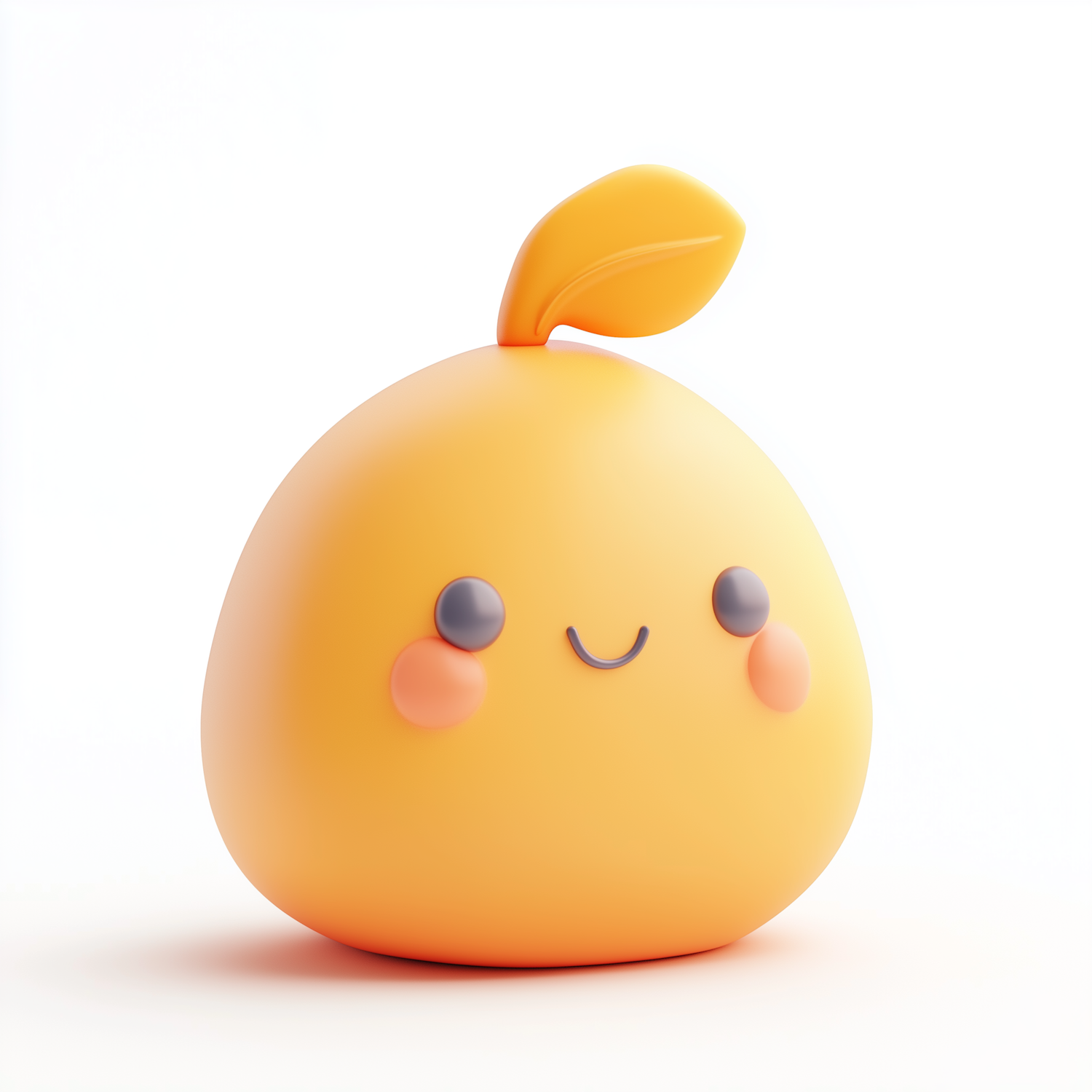 Adorable 3D orange character with a leaf on top, featuring a cute smile and blushed cheeks against a white background.