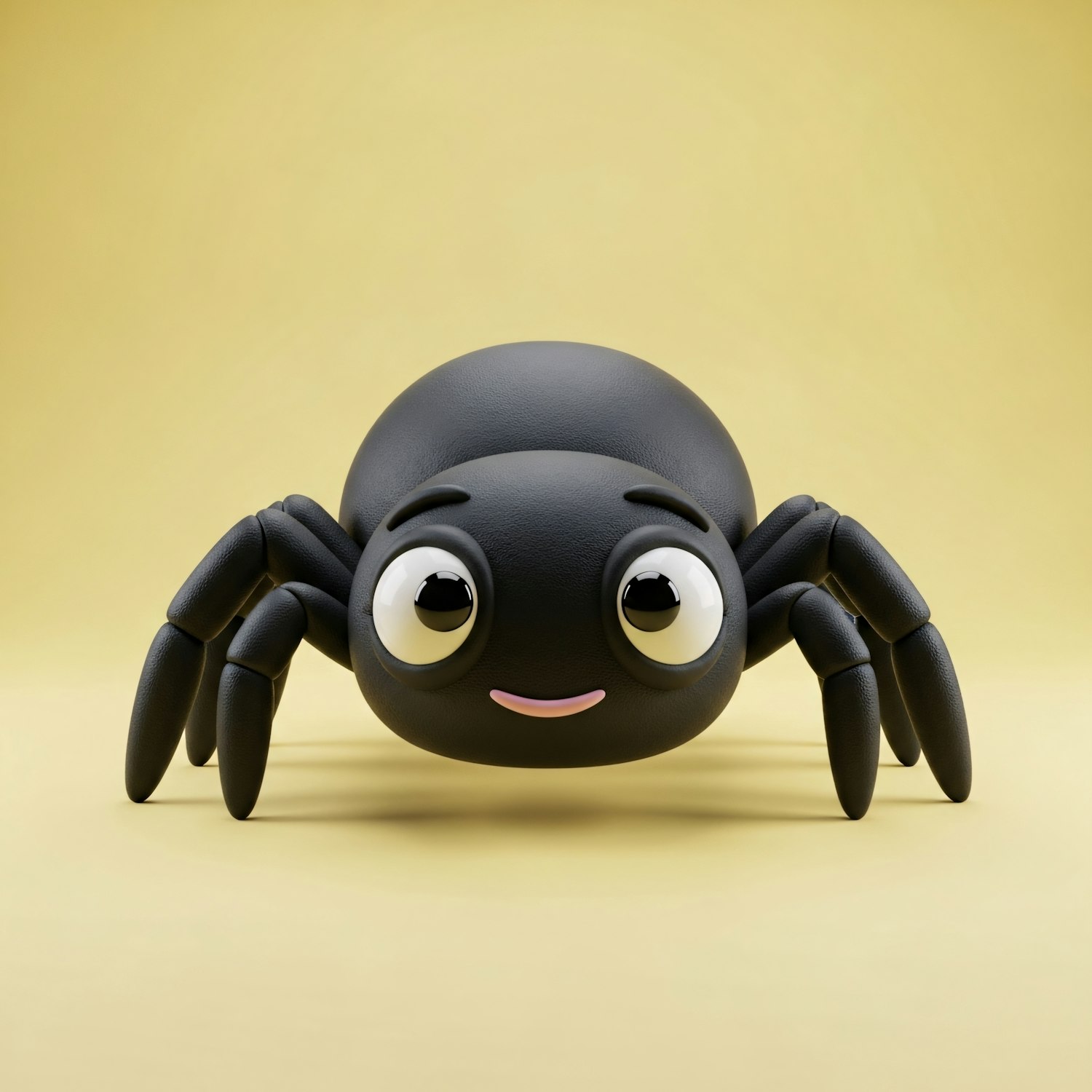 Adorable 3D cartoon spider with big eyes and a smile on a yellow background, perfect for kids' themes or playful designs.