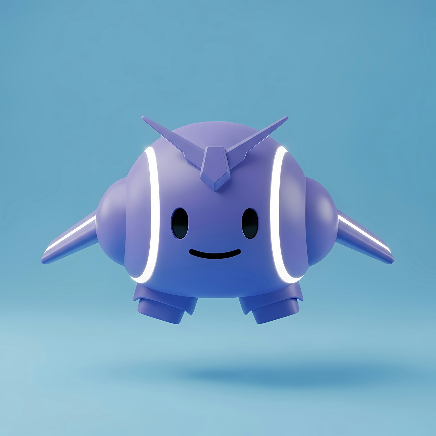 Adorable 3D-rendered purple robot with glowing accents and a smiling face, set against a clean light blue background.