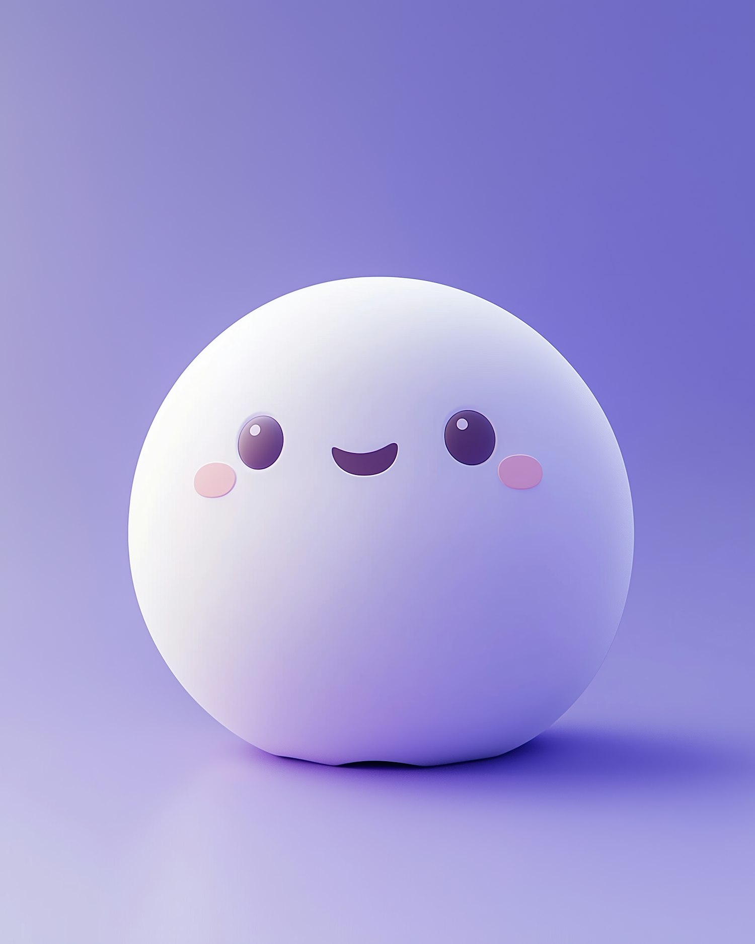 Adorable spherical character with big eyes and a smile on a soft purple background, featuring a cute and playful design.