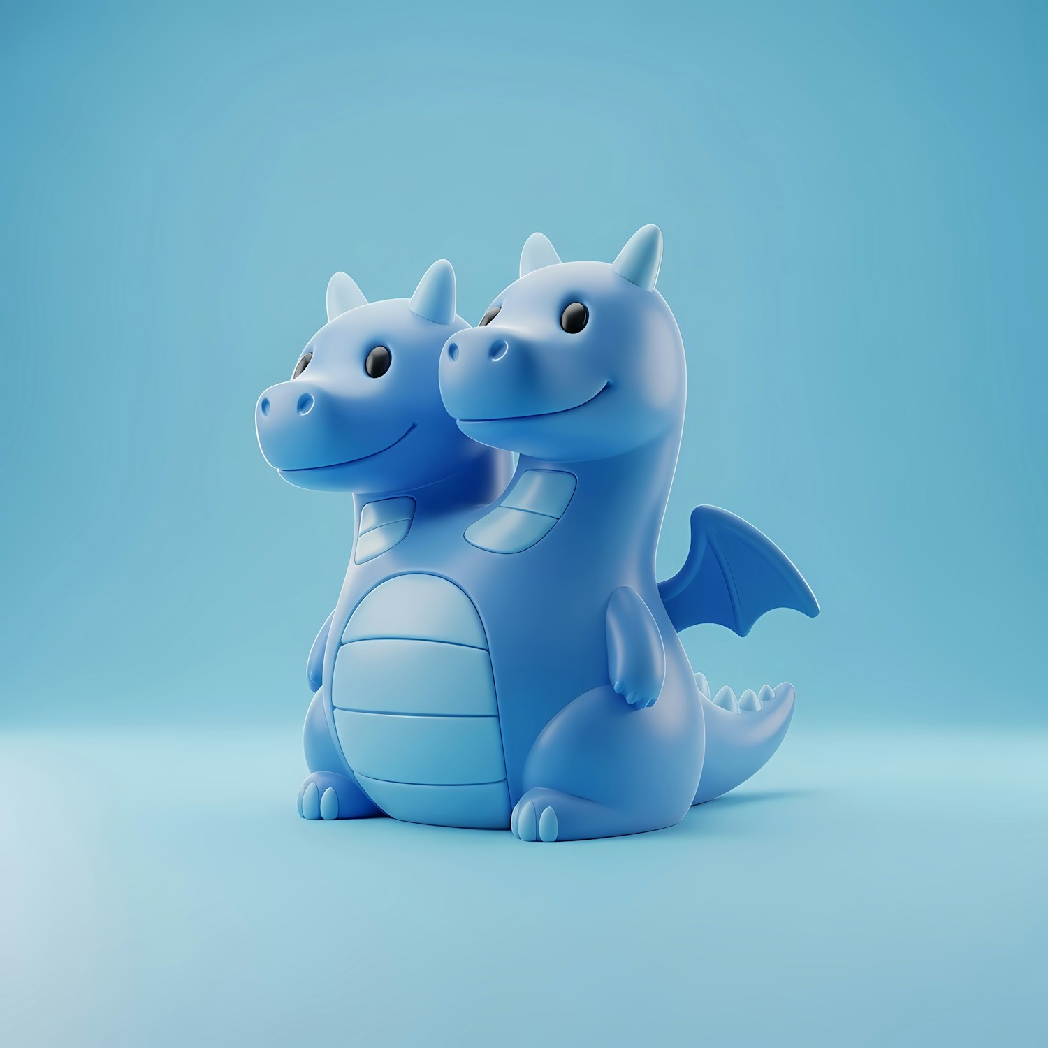 Adorable 3D-rendered two-headed blue dragon toy with a glossy finish, set against a light blue background. Perfect for kids' designs.