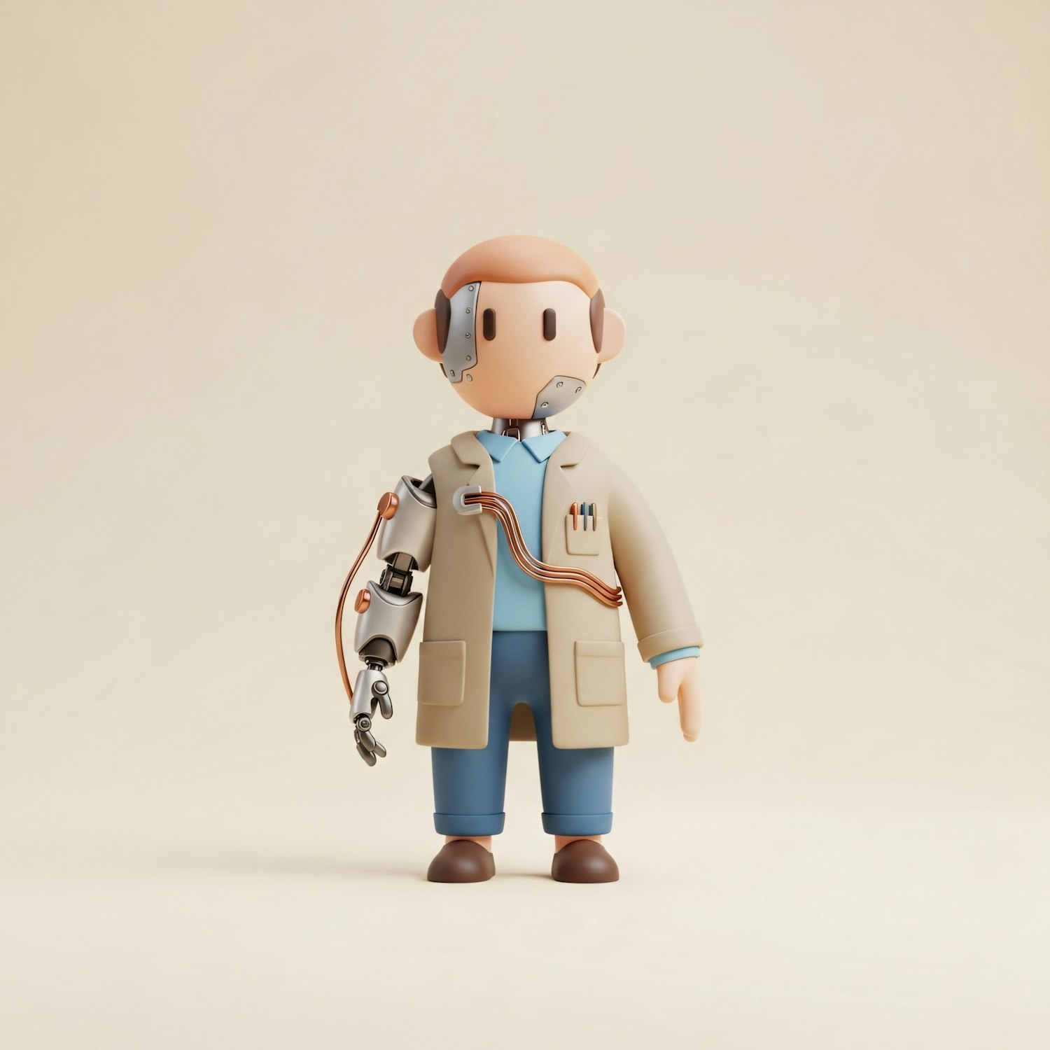 A 3D illustration of a humanoid figure with a robotic arm and cybernetic features, wearing a lab coat and standing against a plain background.
