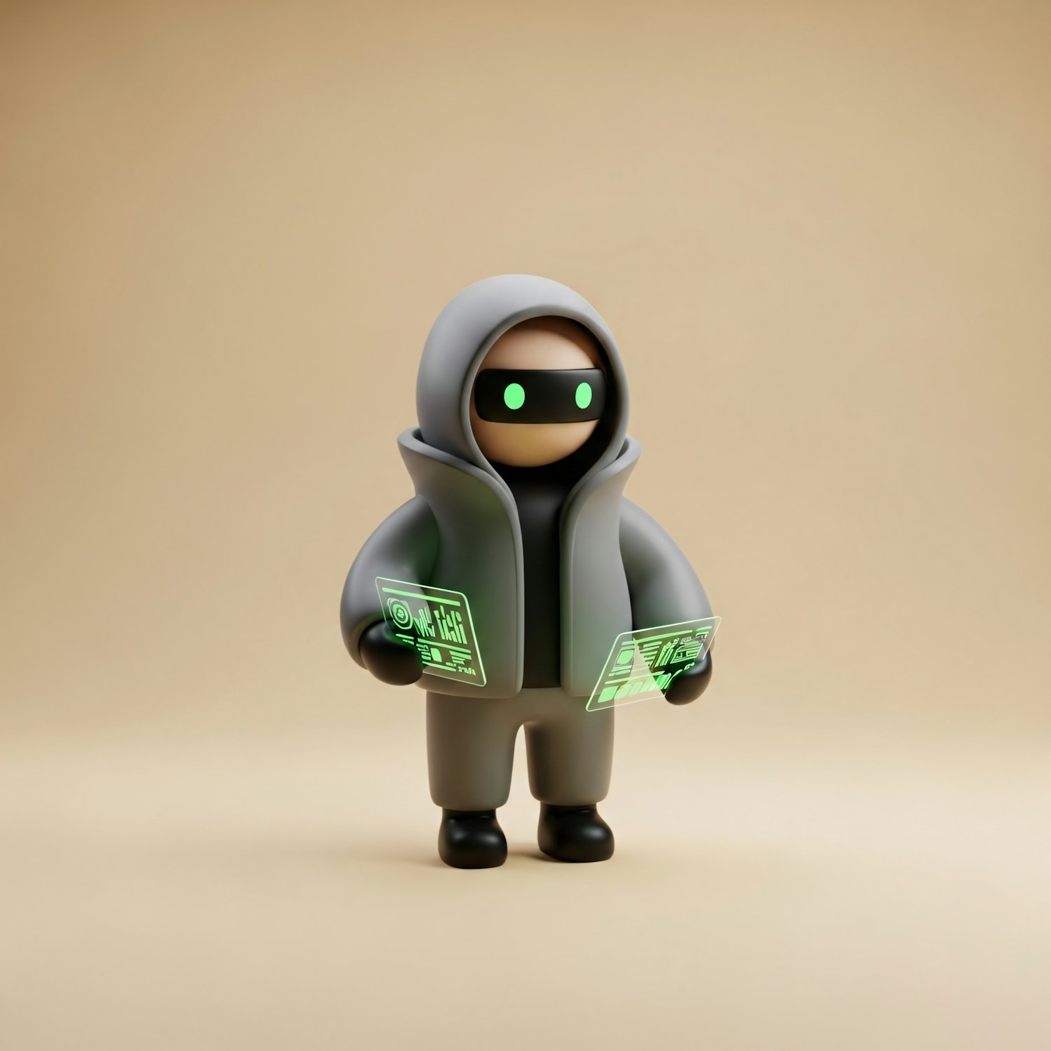A 3D character in a gray hooded outfit with glowing green holographic panels, evoking a futuristic and cyberpunk aesthetic.