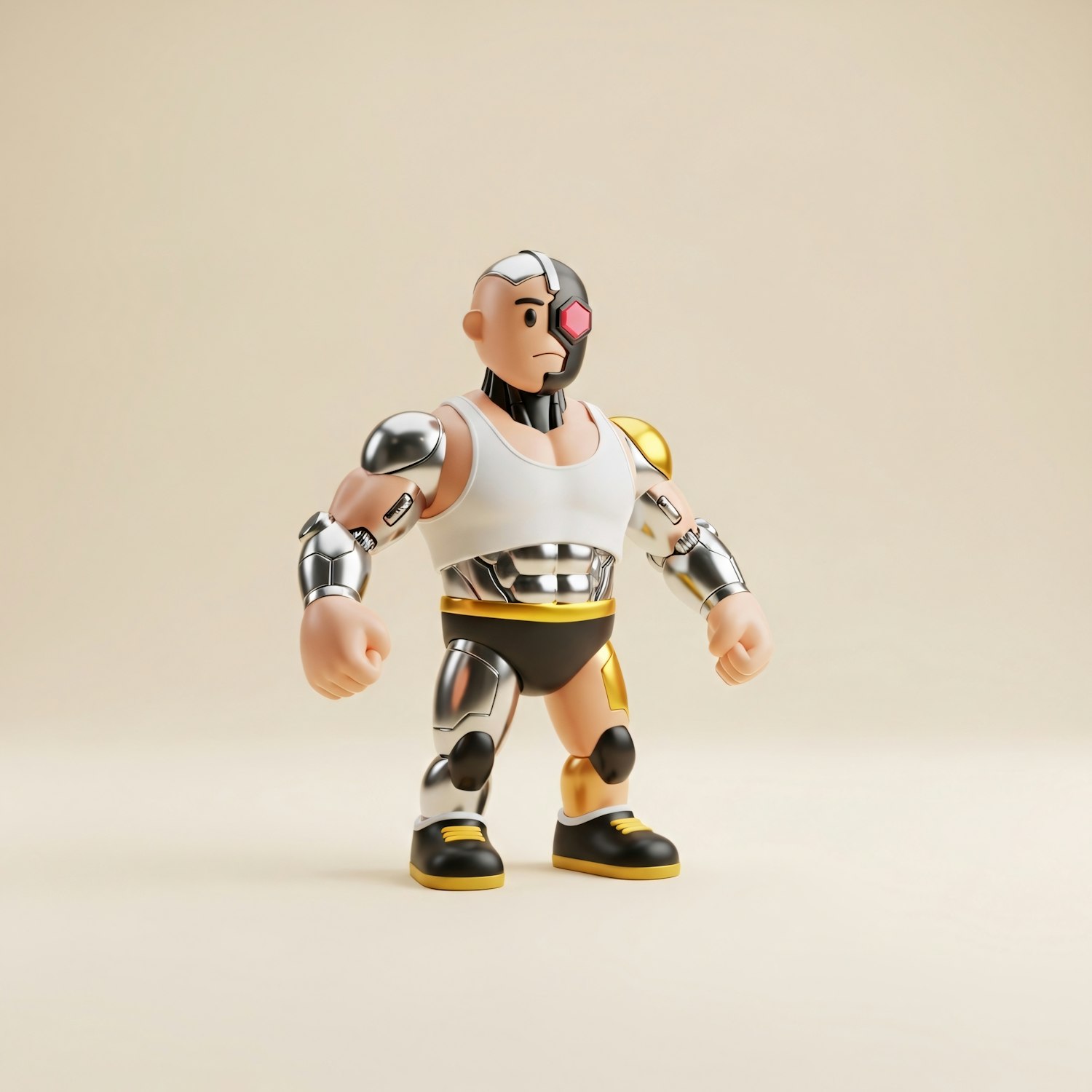 A cartoonish humanoid figure with robotic features, wearing a white tank top and black shorts, with chrome and gold accents.