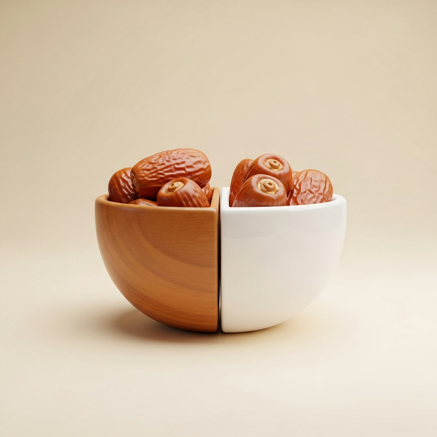 A wooden and ceramic bowl filled with glossy dates, arranged in a minimalist style against a soft beige background.