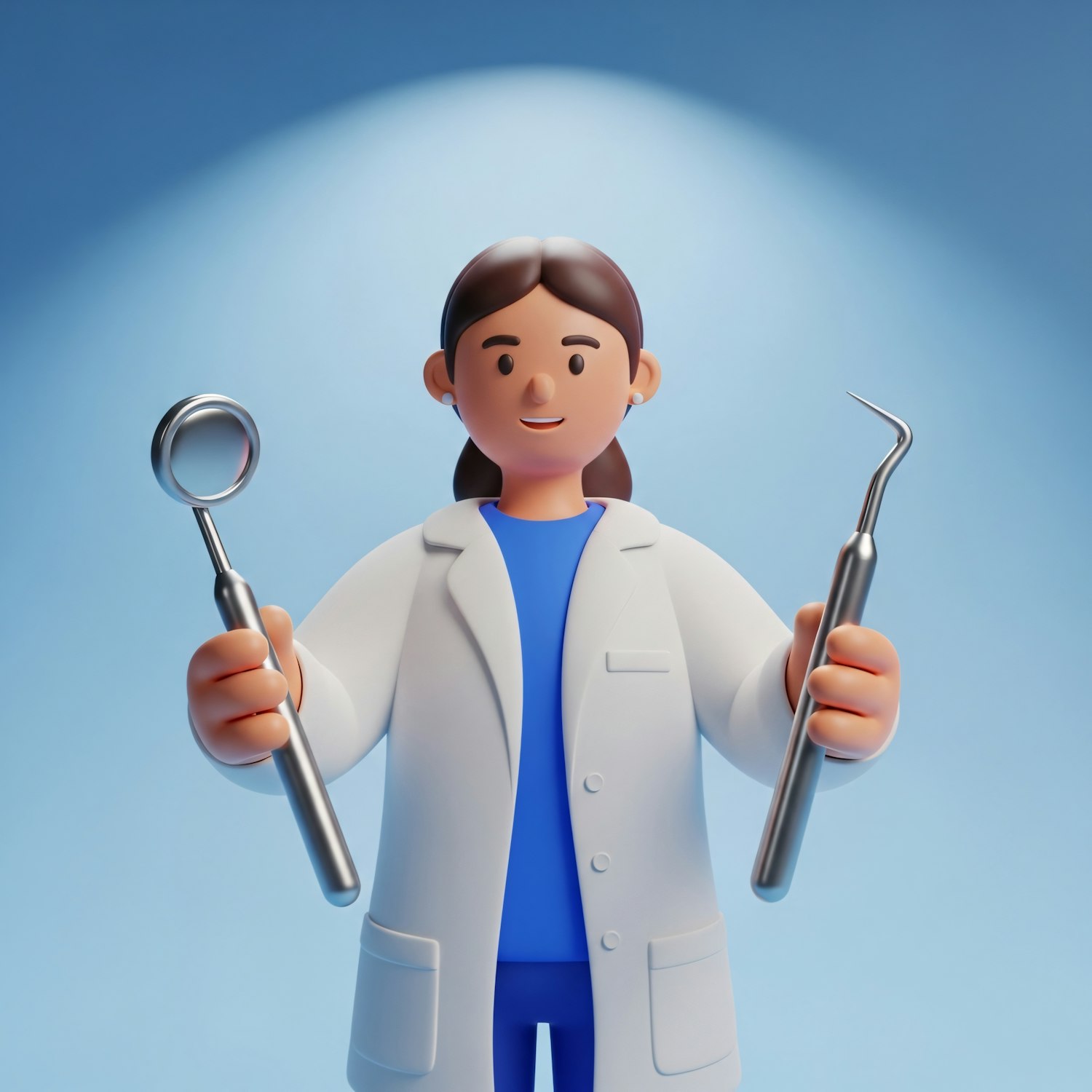 3D illustration of a dentist holding tools, wearing a white coat and blue scrubs, with a light blue background.