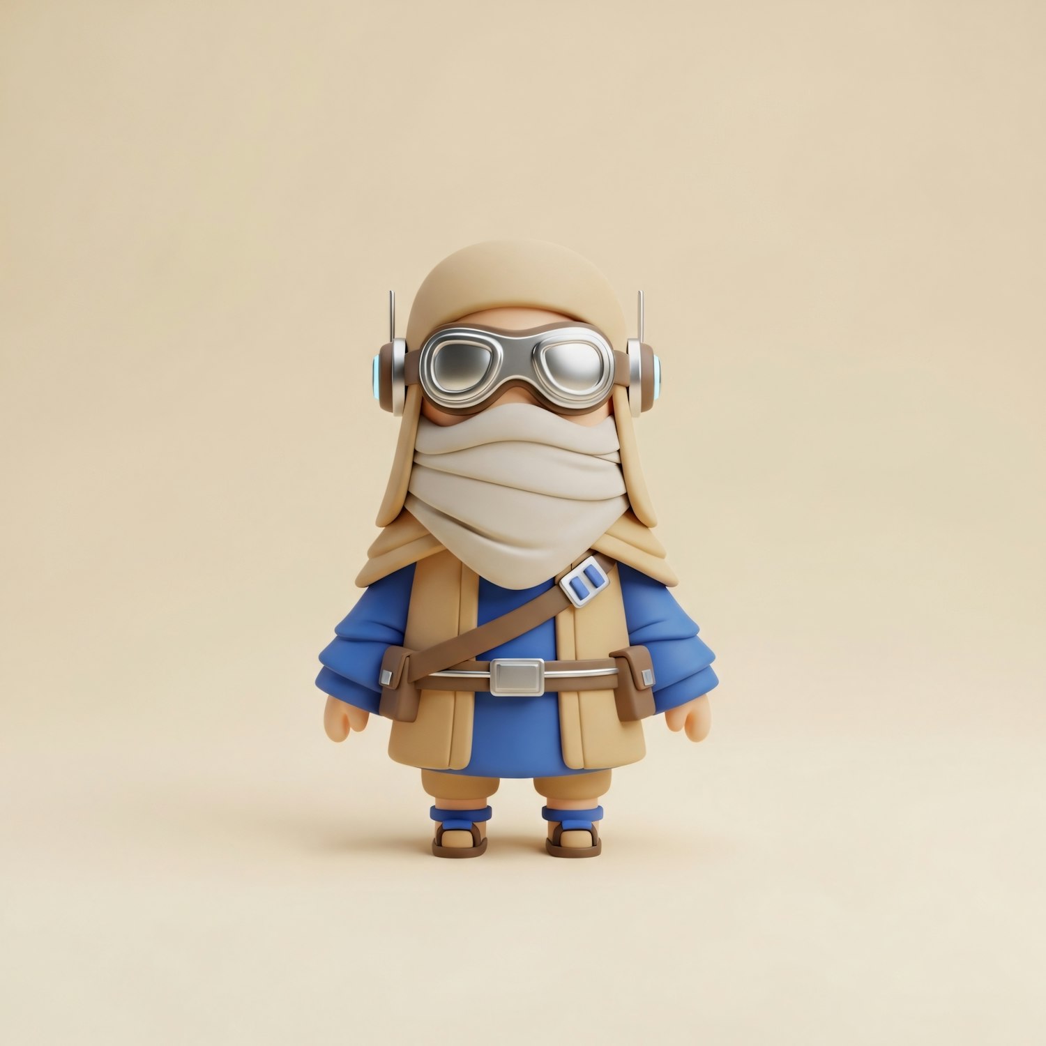 A 3D-rendered character in desert explorer attire with goggles and a headscarf, set against a plain beige background.