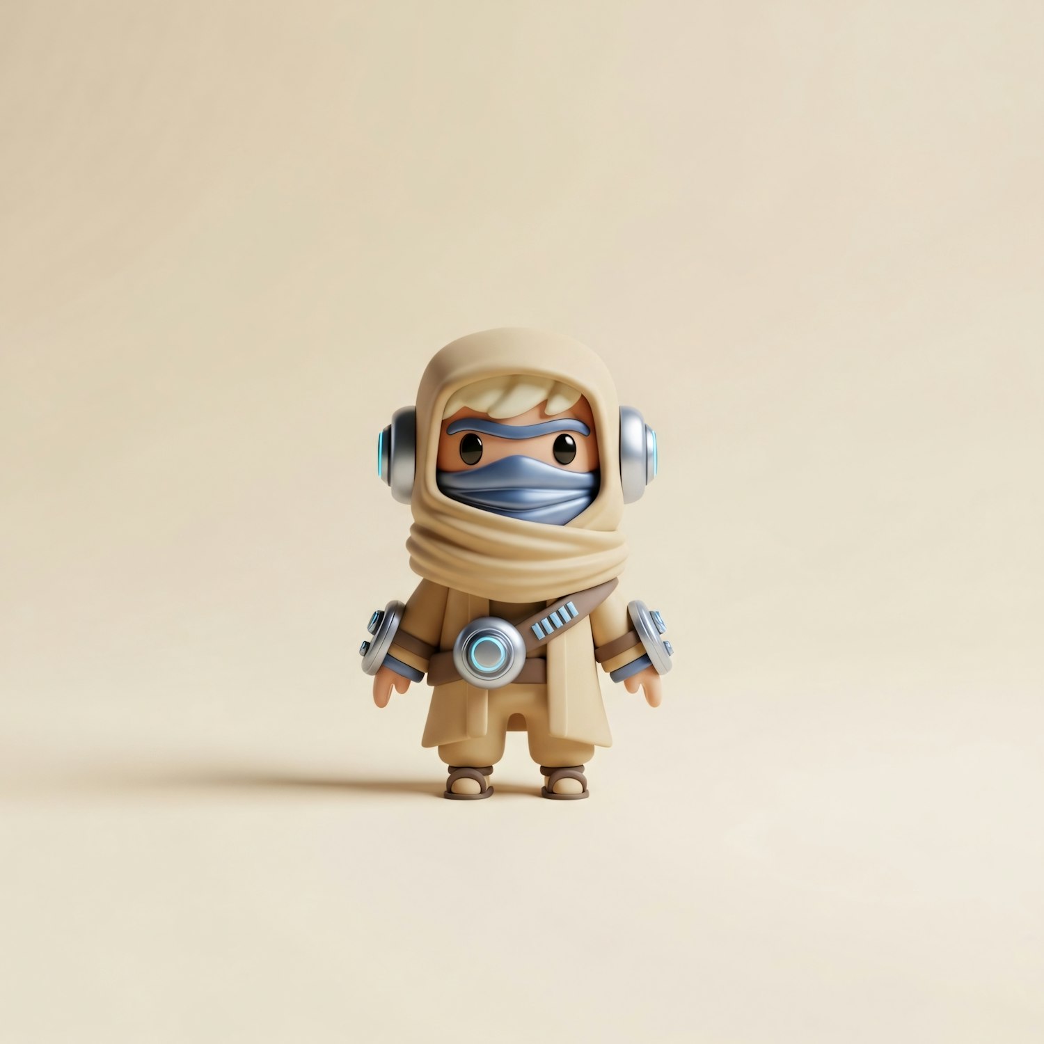 A cute 3D character in a desert-themed outfit with futuristic accessories, set against a plain beige background.