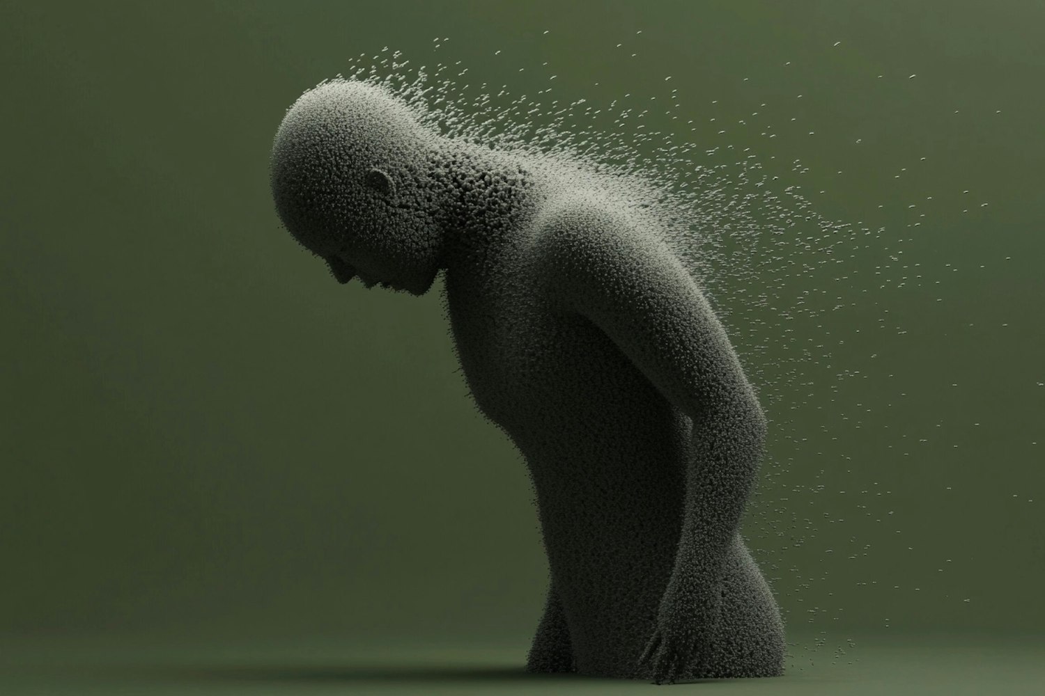 3D illustration of a particle-based human figure dissolving against a green background, conveying transformation and introspection.