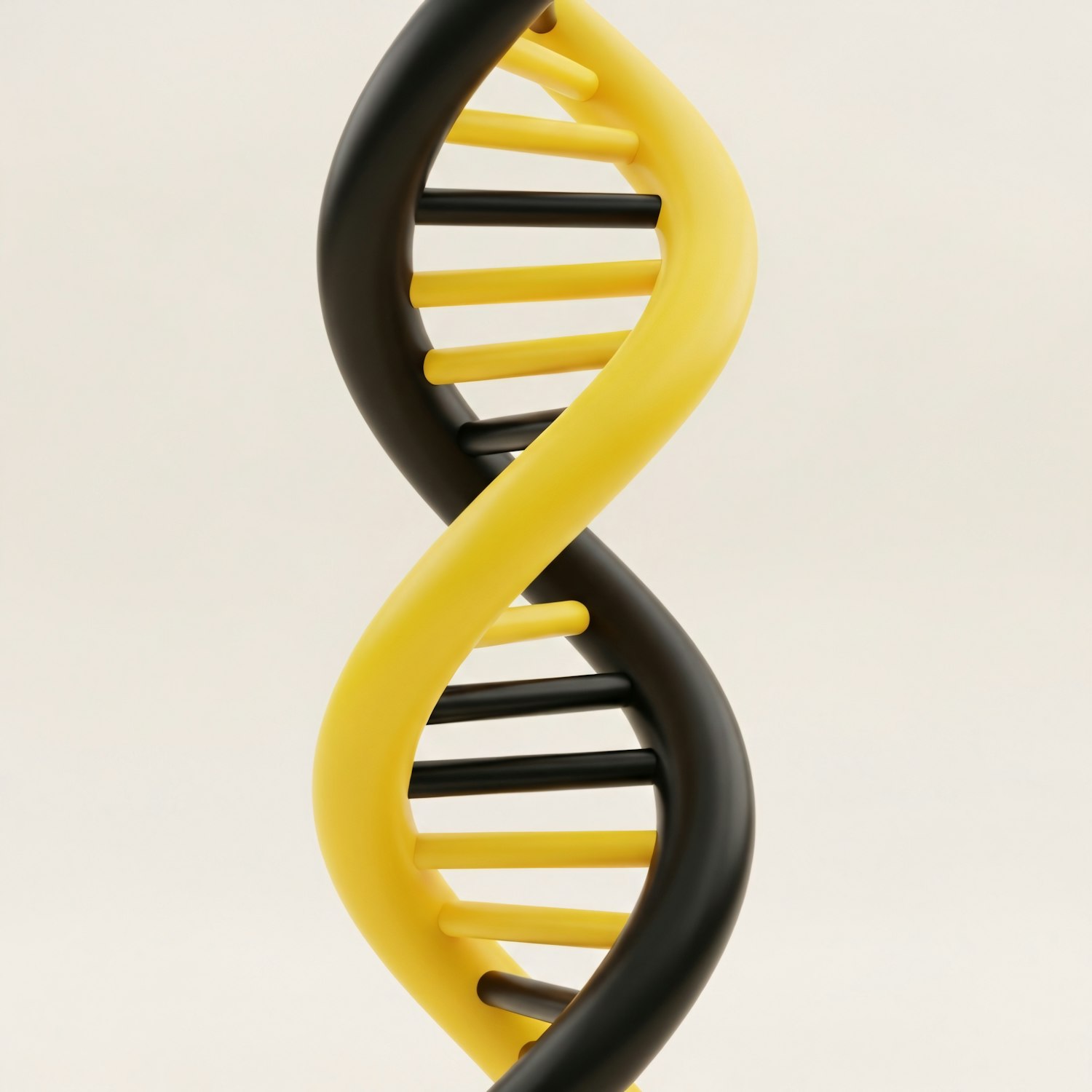 A modern, stylized DNA helix in black and yellow against a neutral background, showcasing a clean and minimalistic design.