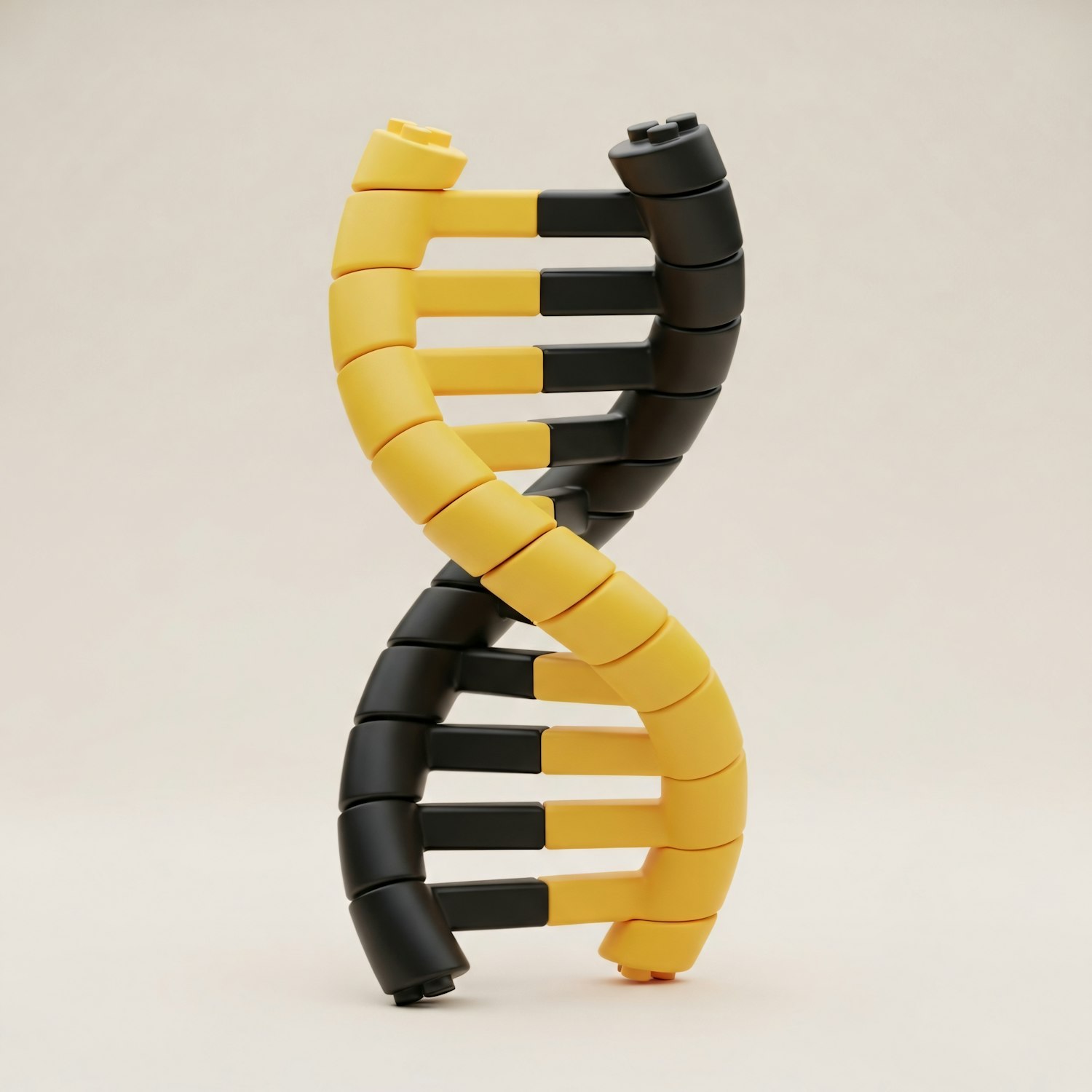 A DNA double helix model crafted from yellow and black interlocking blocks, set against a neutral background for a striking visual.